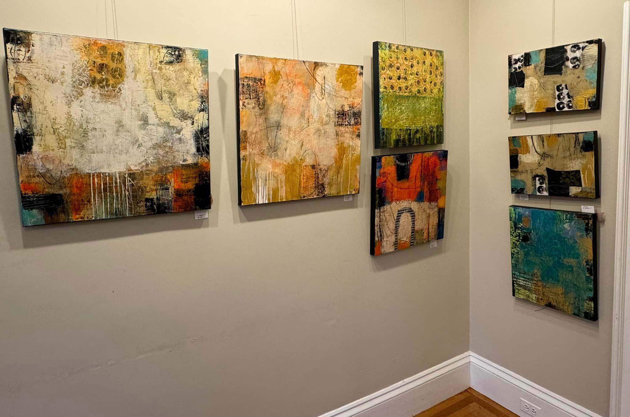Debra Corbett, a longtime Melrose resident and founding member of Melrose Arts, displayed several pieces of abstract, mixed-media art in her section, each one textured and lively. She explained that she had done more traditional art years ago, but found that “other people have done nice landscapes” and she wanted to create something more elusive and less recognizable, that would allow viewers to place their own interpretations and emotions onto the painting.