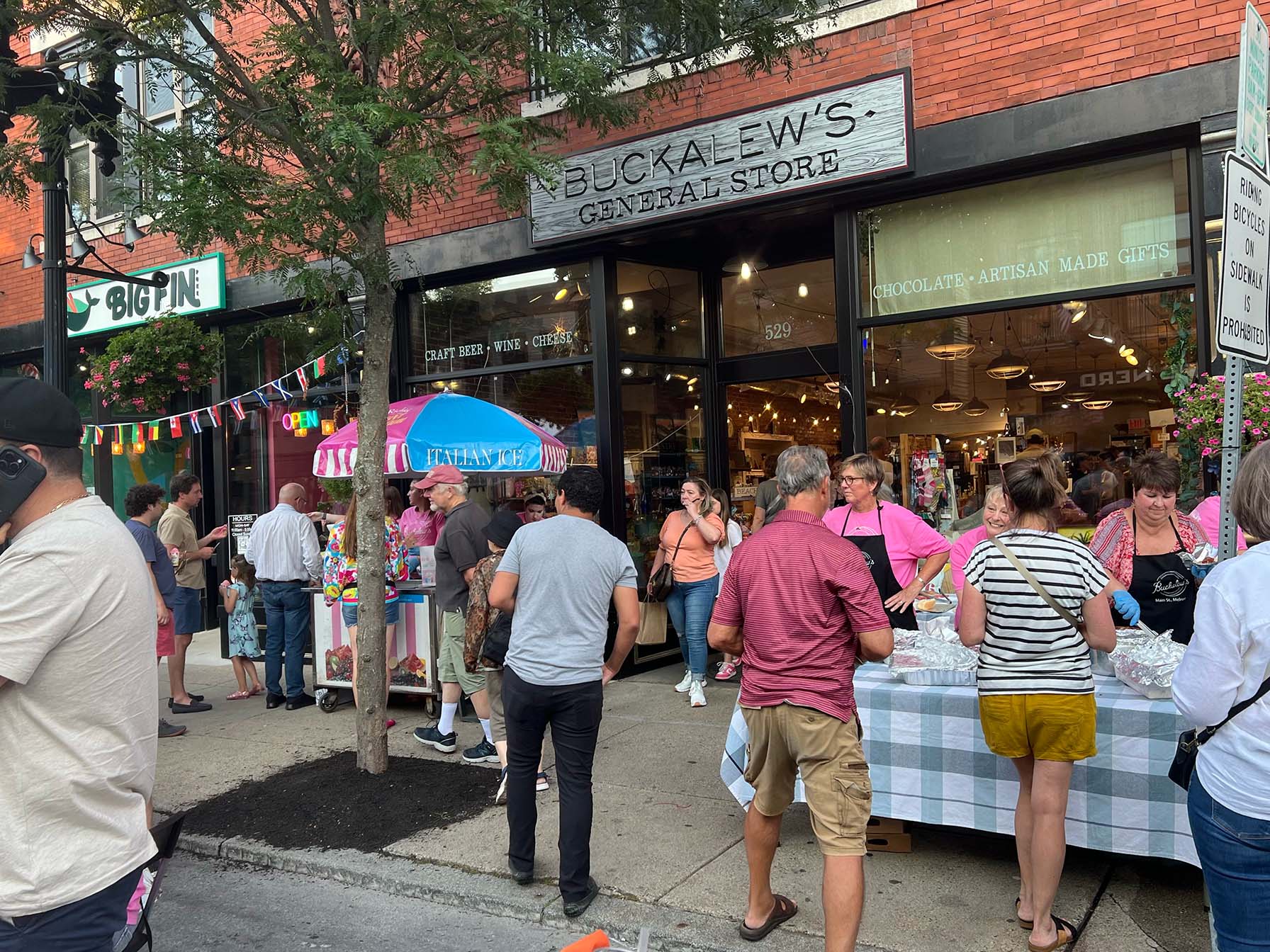 The evening coincided with the Opening Ceremonies of the Paris Olympics, so many businesses offered Olympics-themed activities. Kids could be seen tossing rings onto cones in front of Lilah Rose. Cornhole boards were out in front of several businesses. And there were plenty of Olympics-themed photo opportunities.