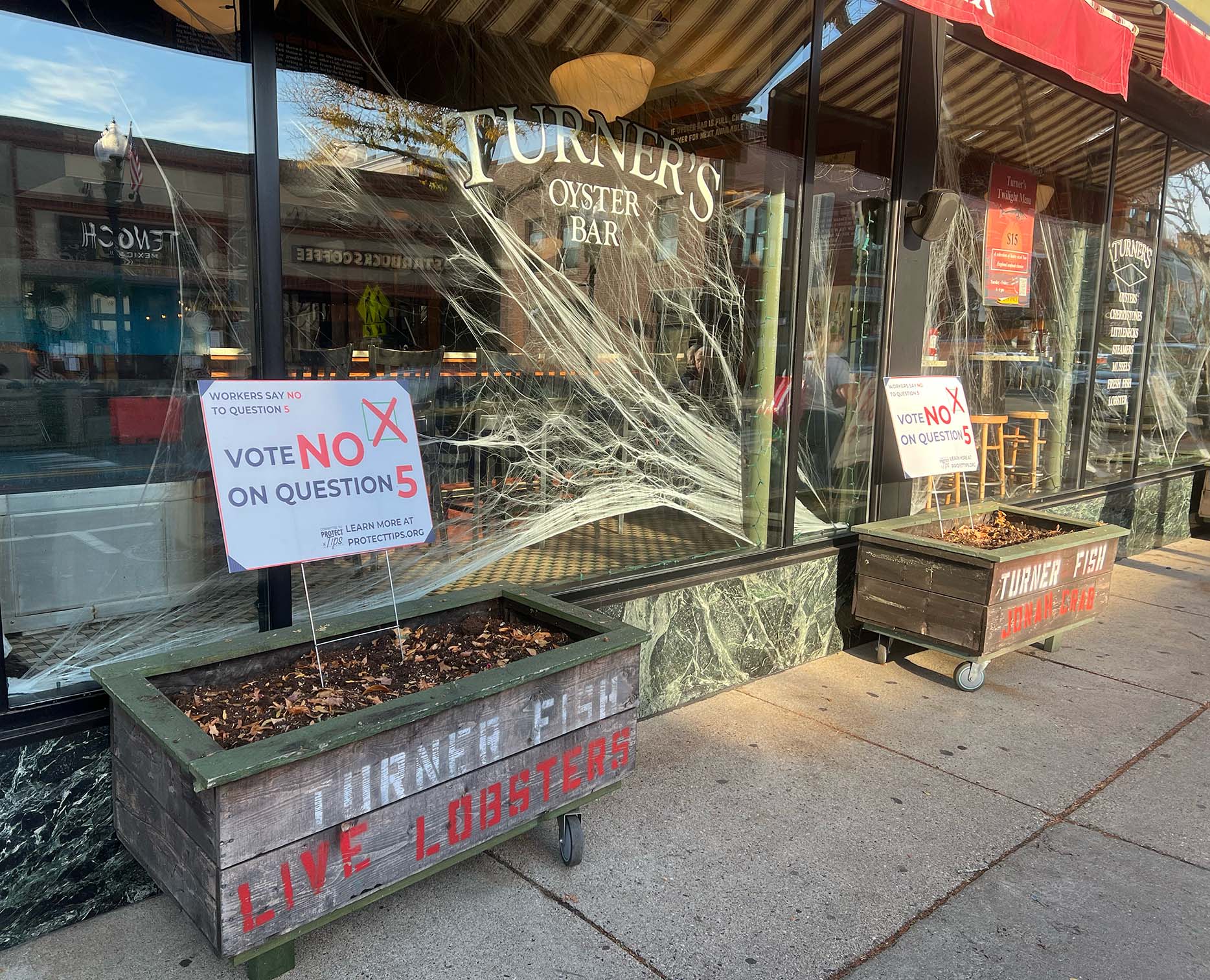 Signs for No on 5 in front of Turner's Seafood