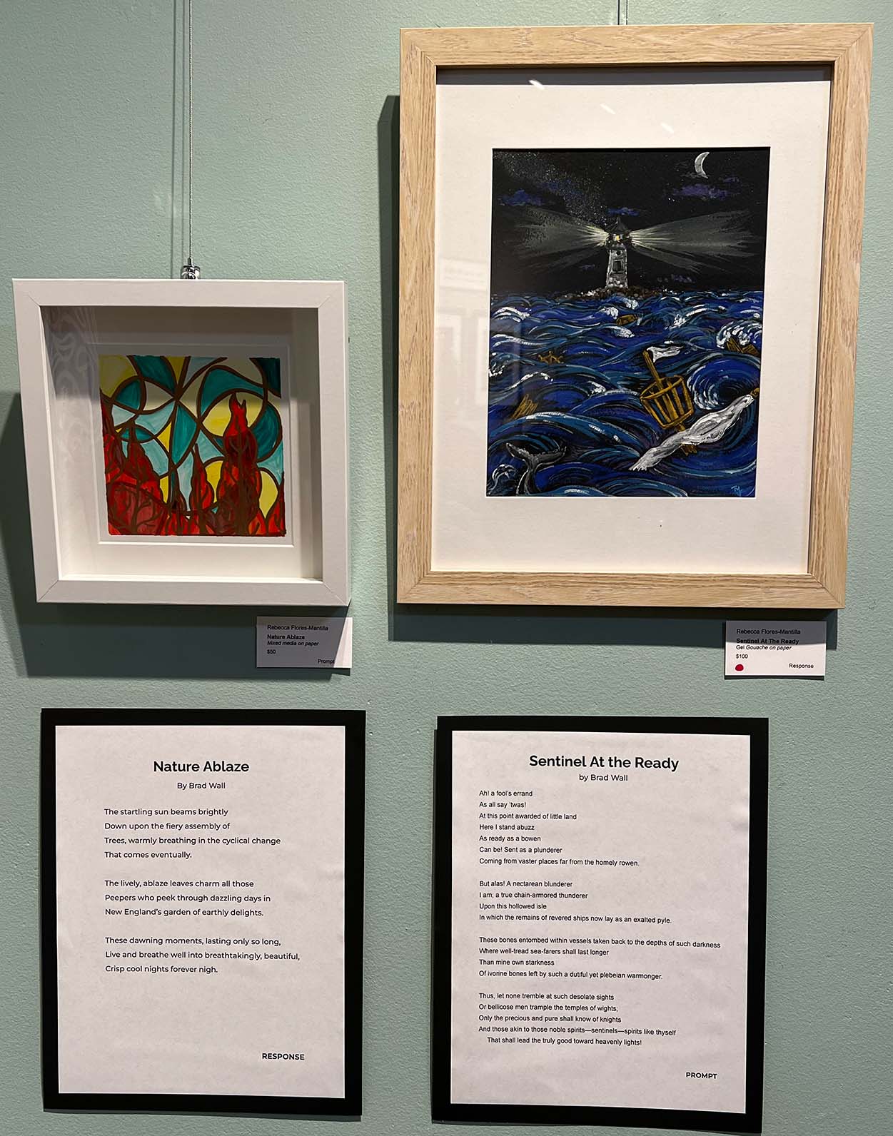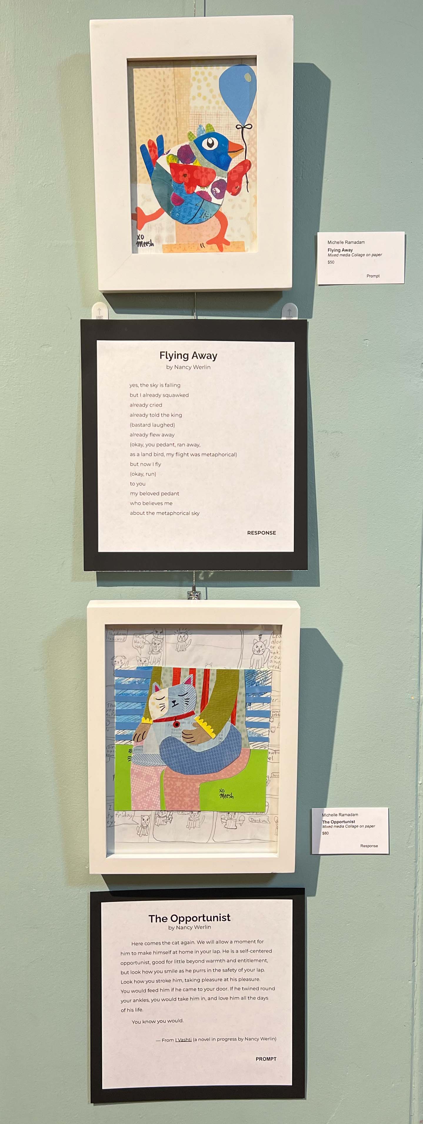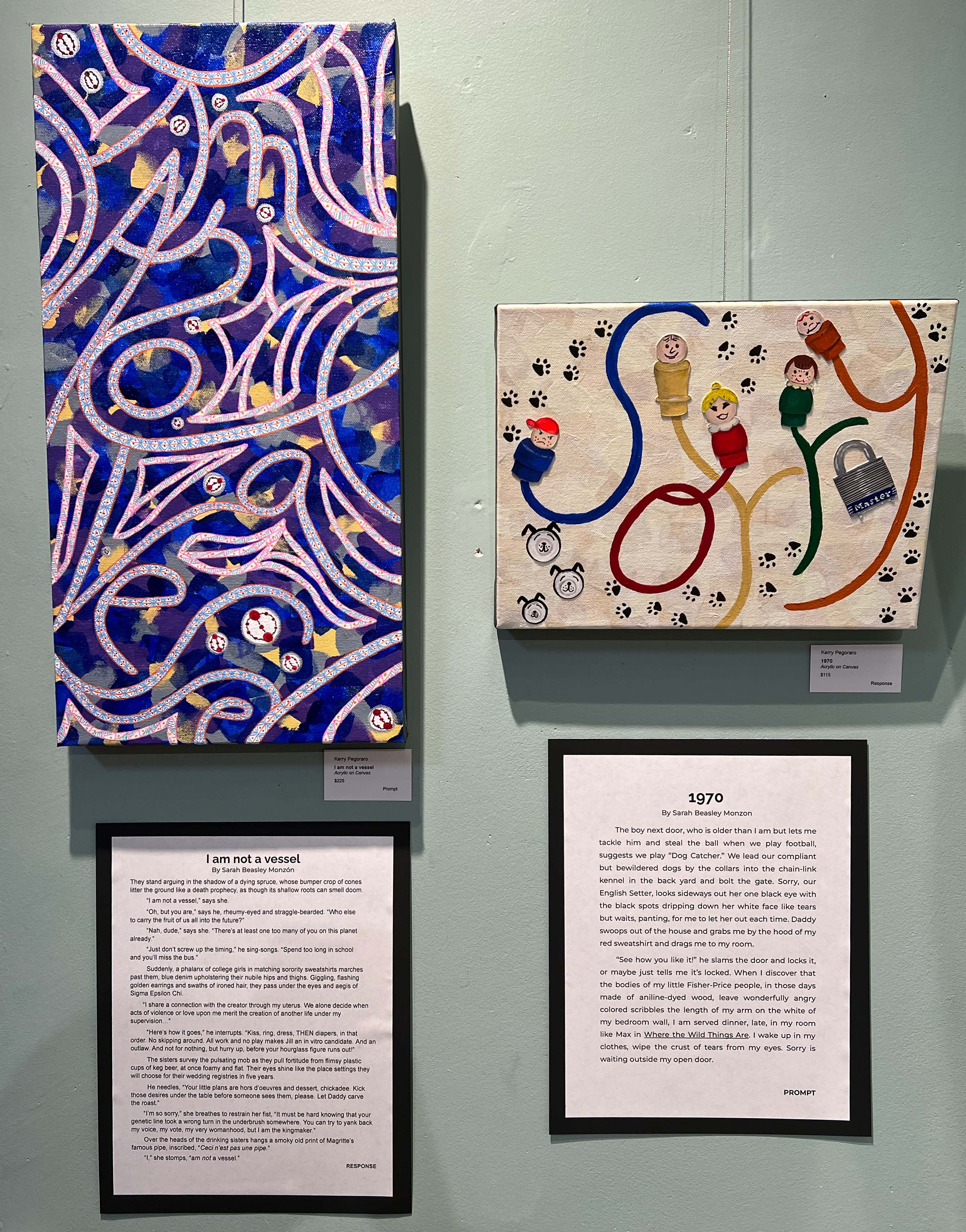 Each artist or writer gave their partner a piece, and then each artist or writer was tasked with creating a work in response, so that each pairing generated four pieces - two written and two visual media. The written pieces might be poems, short stories, or excerpts from larger works, although they could be no longer than 350 words. The visual works could be small paintings, drawings, pieces of mixed-media art, or even textile art, although they were limited in size to no more than 16 inches square. Key to the exchange was the rule that each pair of pieces needed to share the same name, which was set by the artist or writer who provided the original or “prompt” piece.