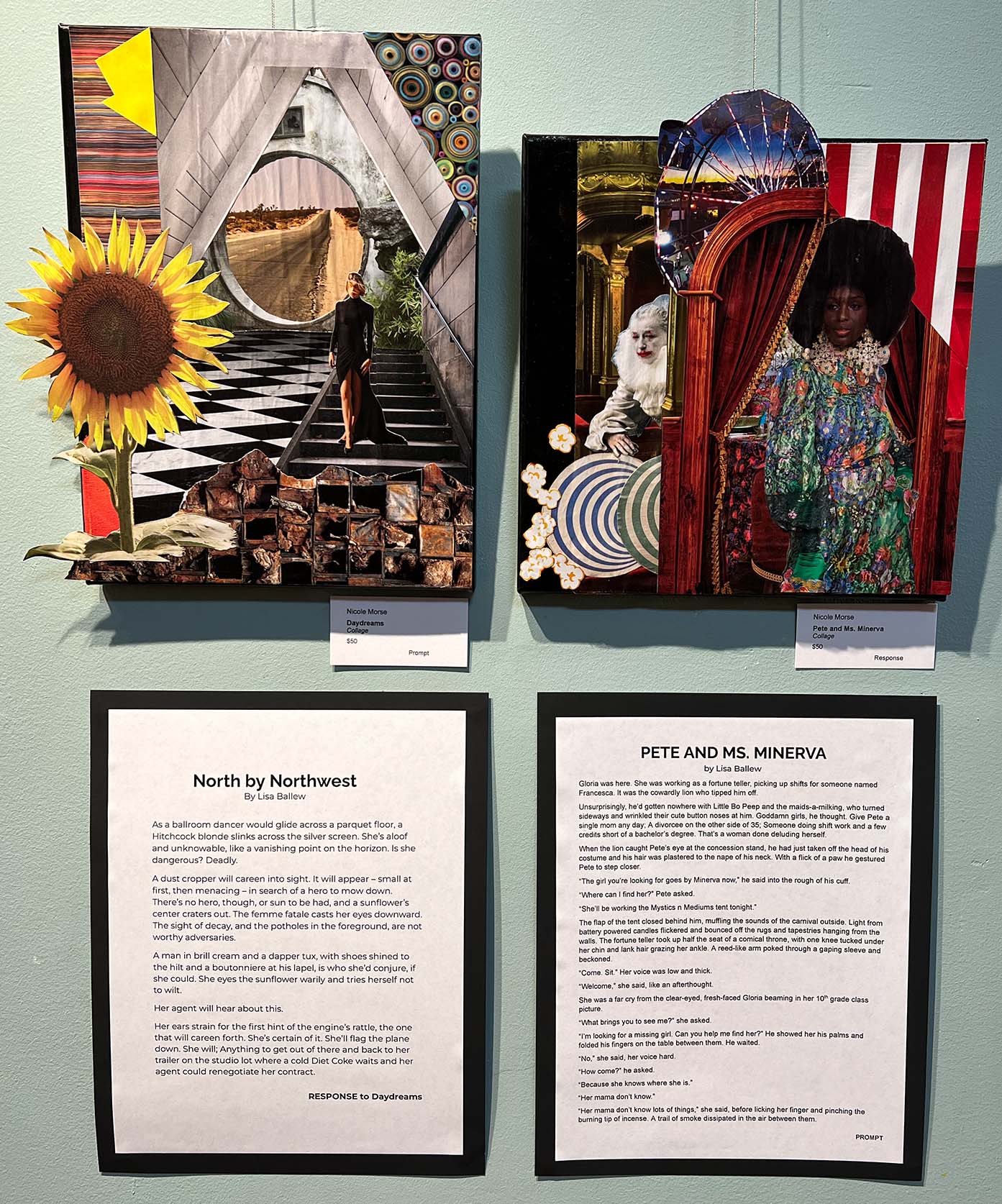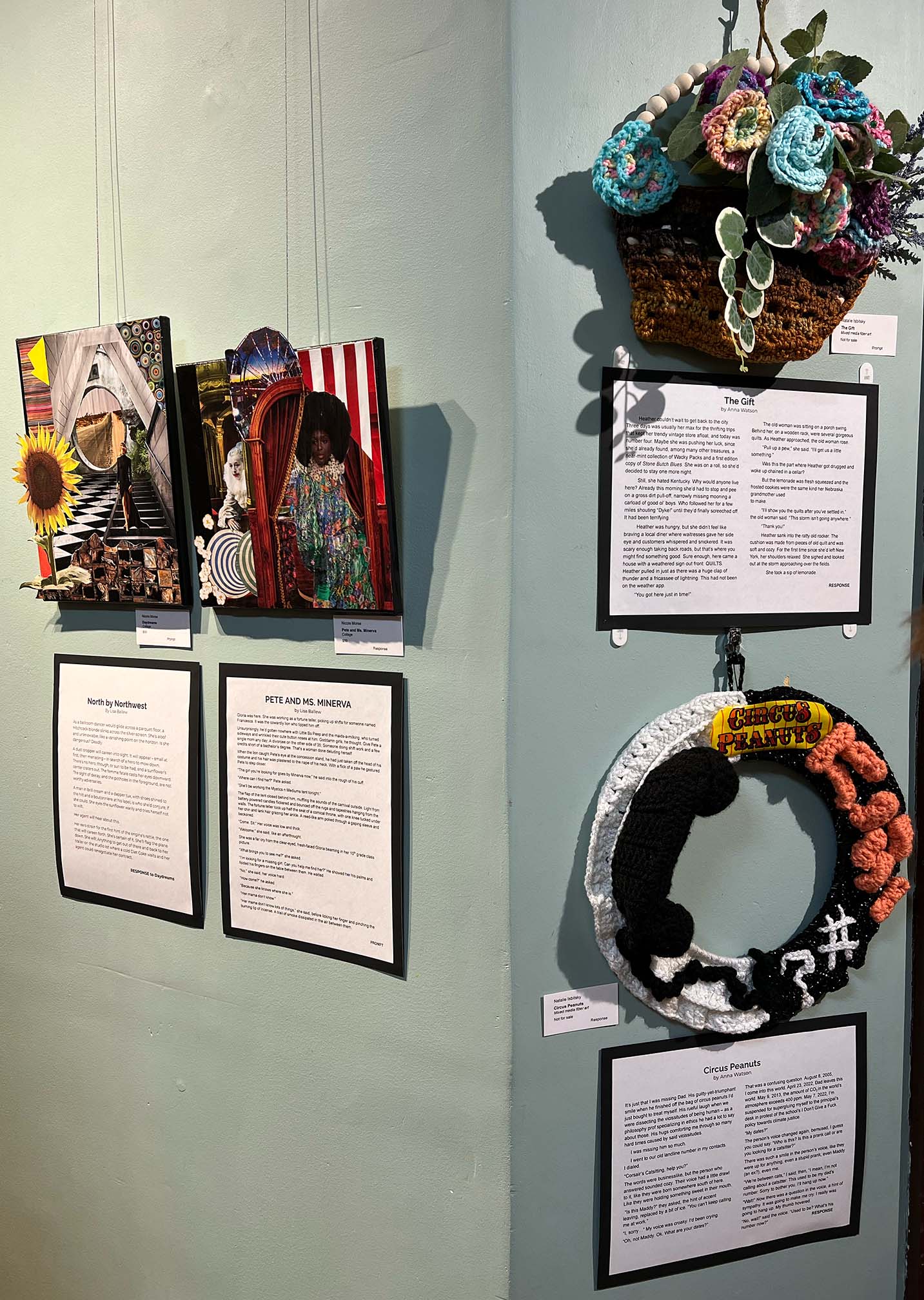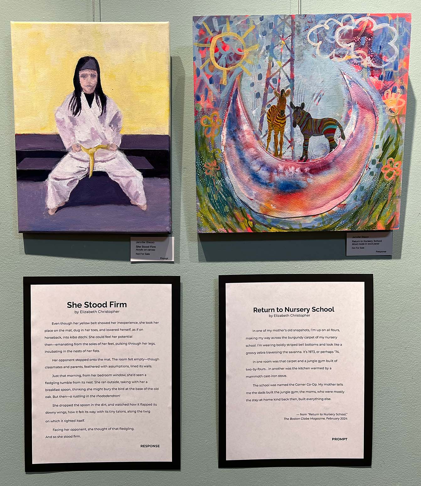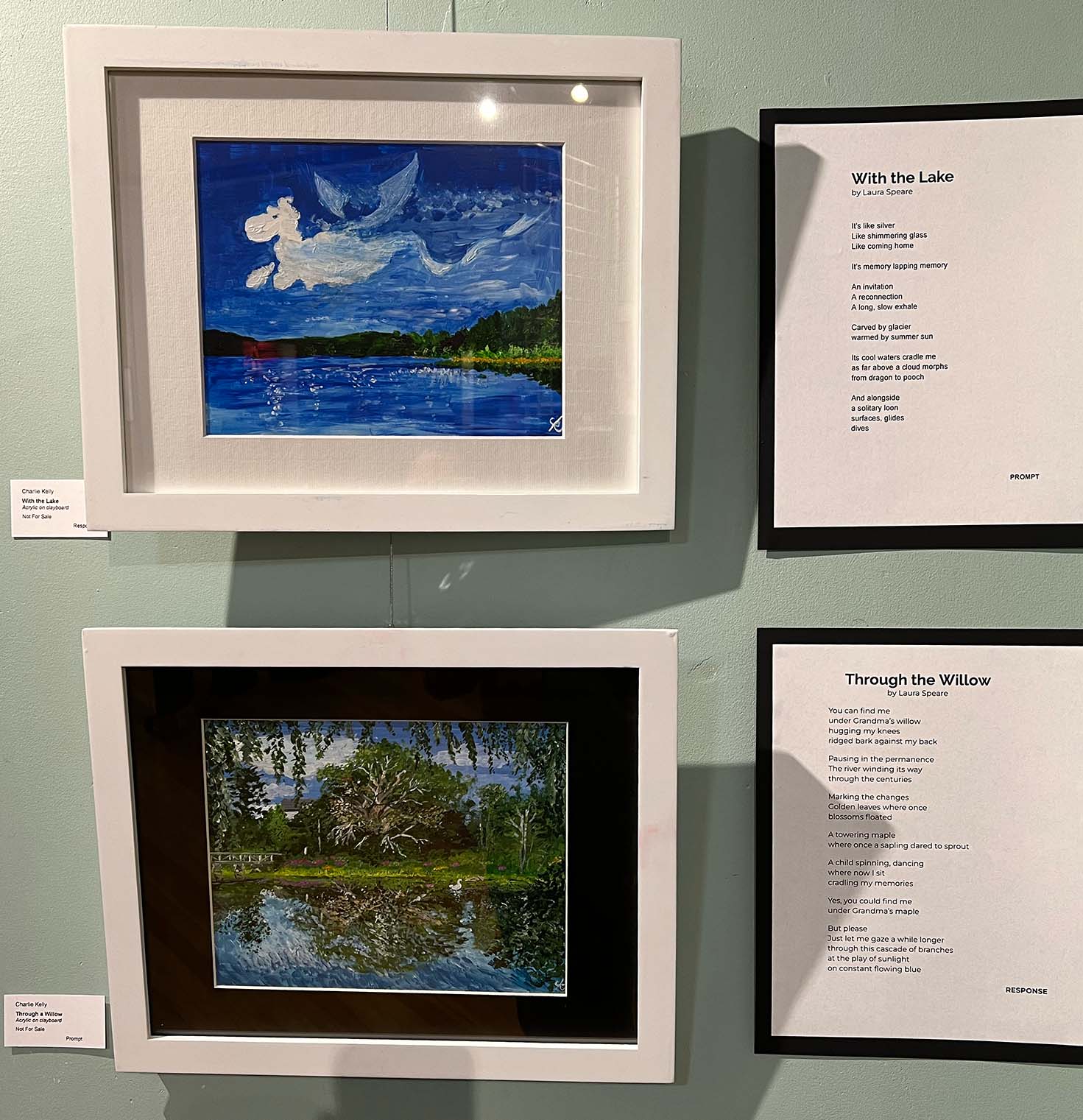 Each artist or writer gave their partner a piece, and then each artist or writer was tasked with creating a work in response, so that each pairing generated four pieces - two written and two visual media. The written pieces might be poems, short stories, or excerpts from larger works, although they could be no longer than 350 words. The visual works could be small paintings, drawings, pieces of mixed-media art, or even textile art, although they were limited in size to no more than 16 inches square. Key to the exchange was the rule that each pair of pieces needed to share the same name, which was set by the artist or writer who provided the original or “prompt” piece.