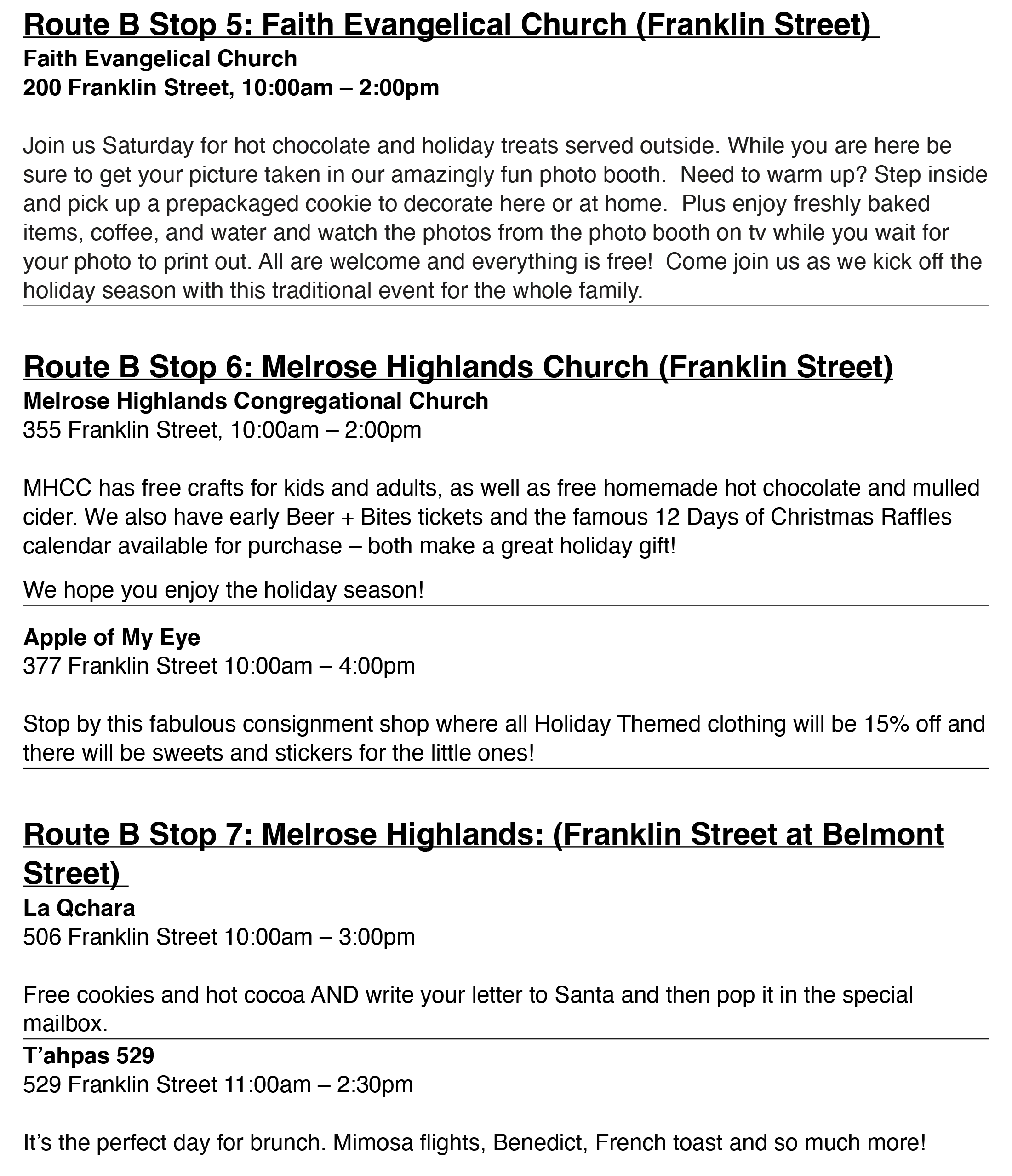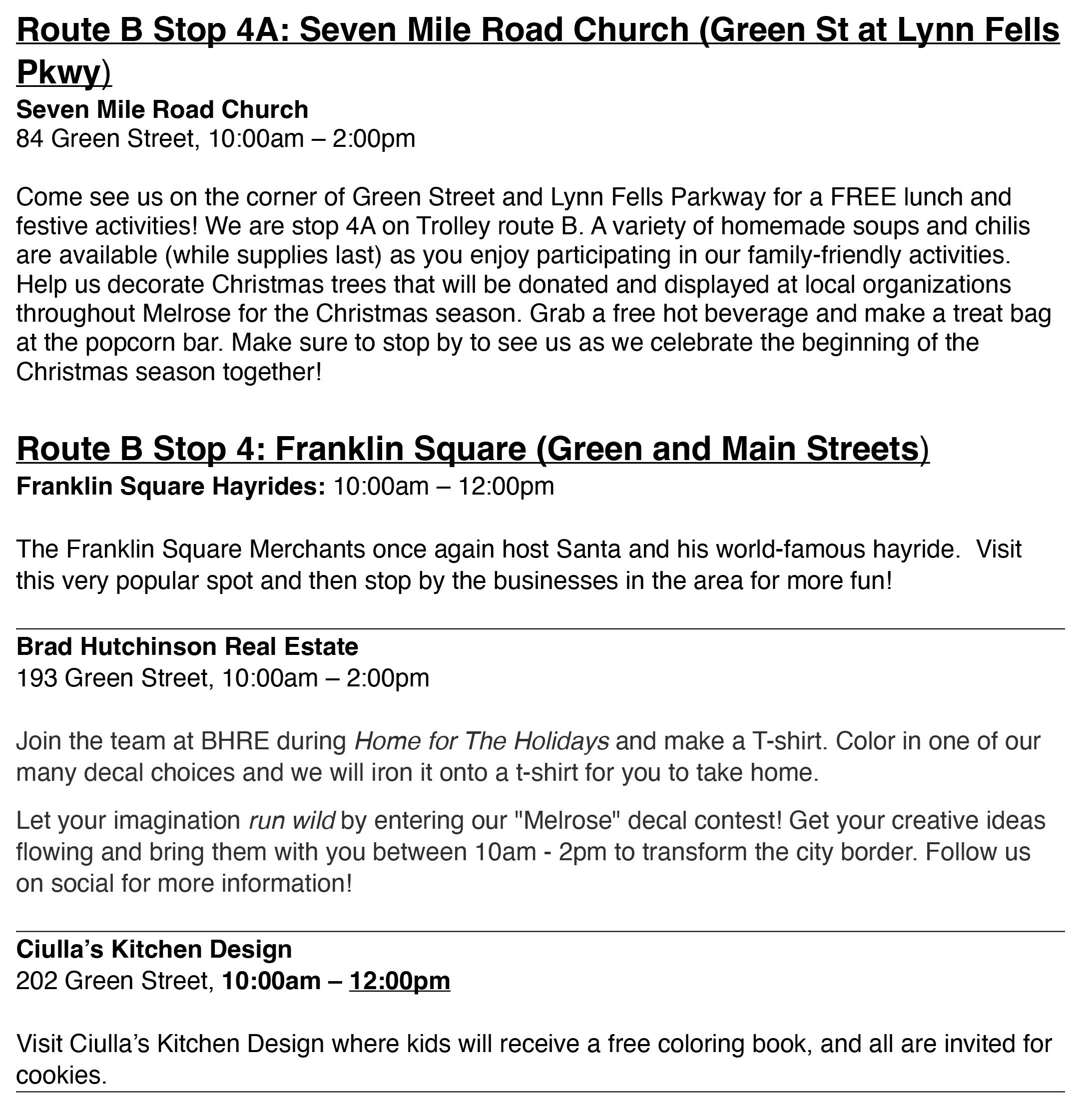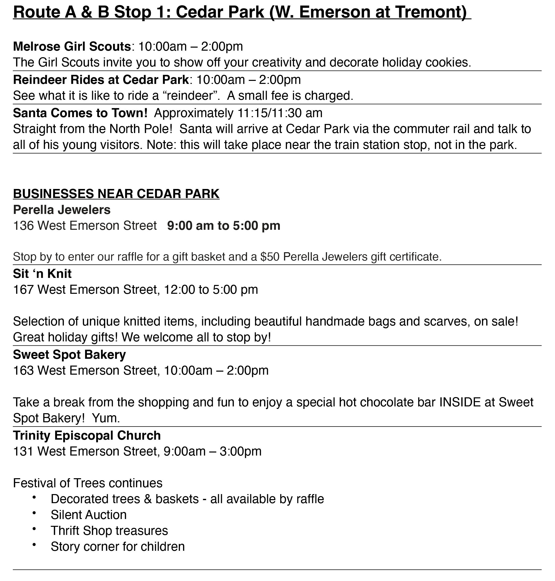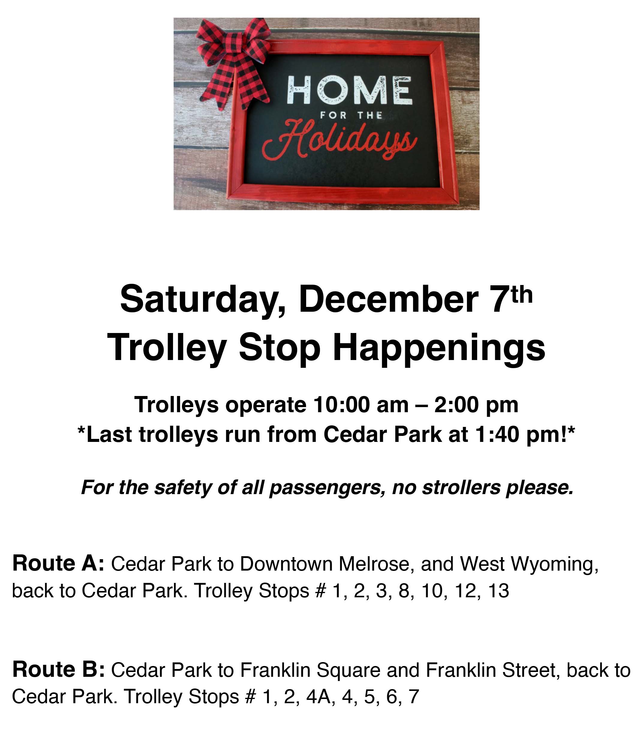 At Cedar Park, where both trolley routes will originate, there will be "reindeer" rides, cookie decorating, and Santa will arrive on the commuter rail. In Franklin Square, Santa will be offering hayrides.