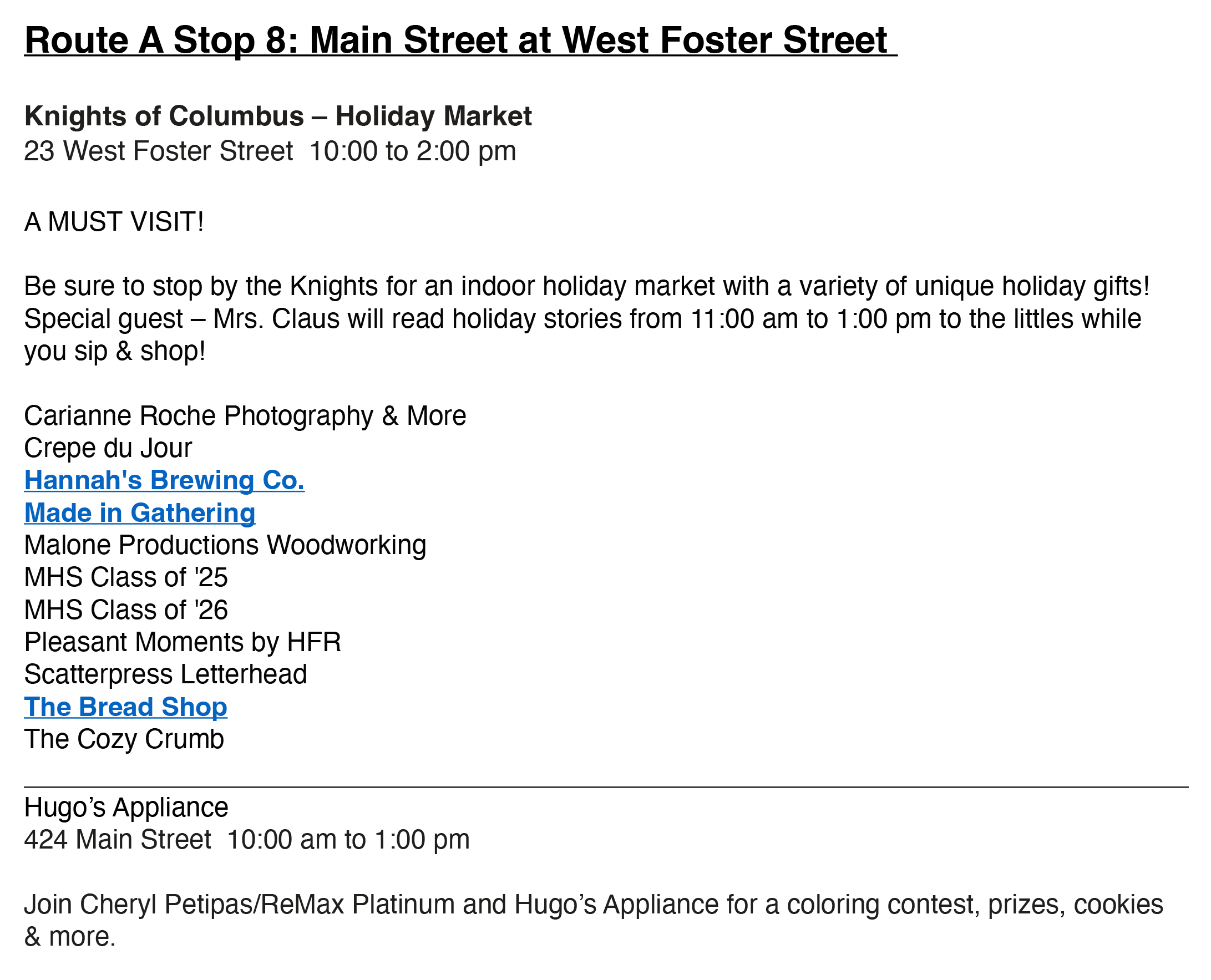 On Saturday between 10am and 2pm, holiday trolleys will be running along the two routes shown in the map, right. Events will be taking place throughout the city, and the trolleys will help attendees get from one place to the next easily and quickly. Check the Chamber of Commerce website frequently, as events may change and more might be added.