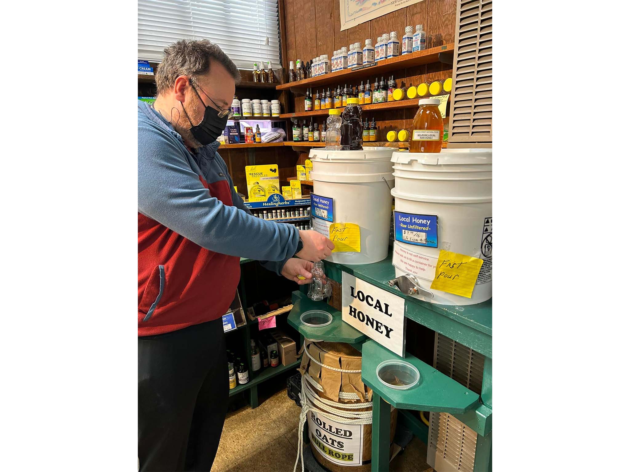 The honey is local. They have vats of light or dark honey in addition to prefilled bottles. The dark honey has a slight molasses flavor and is incredible over yogurt and for cooking. I highly recommend the dark honey!