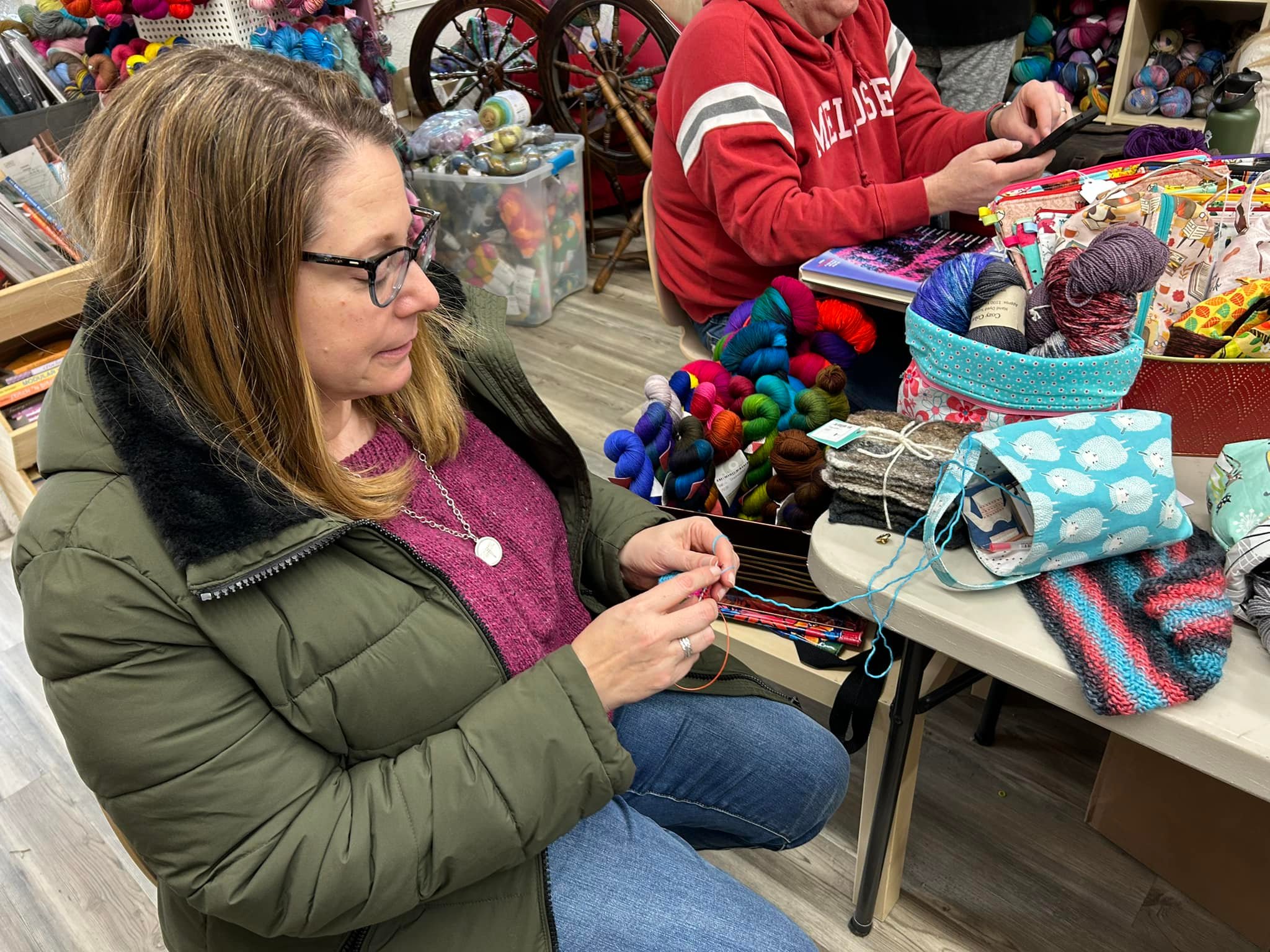 The shop has open knit hours where all skill levels are welcome to come crochet, knit, learn, and share adventures.
