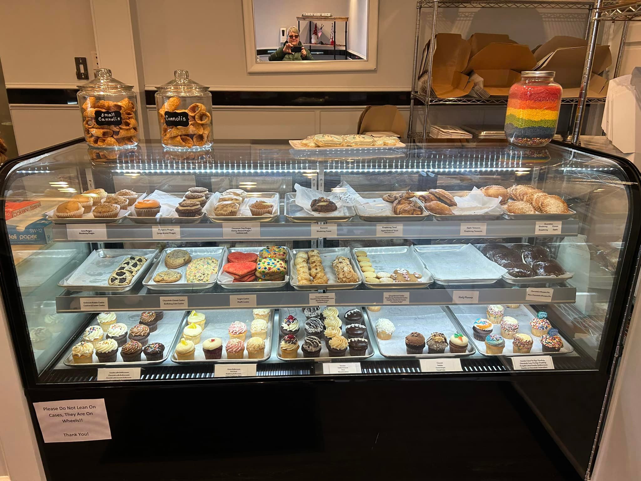 The cases are filled with cakes (you can also preorder and customize), cupcakes, and cookies. Breakfast treats - scones, muffins, turnovers and brambles. Chicken pies – mashed potatoes, vegetables, and chicken with a delightful crust.