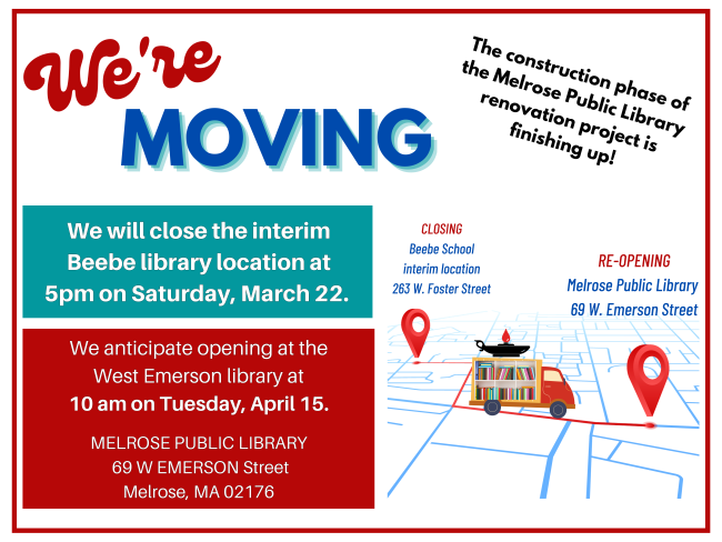 This week, the Melrose Public Library announced that the permanent library building, which has been under construction since the fall of 2022, will be reopening on April 15th. The temporary library in the Beebe School building will close on March 22nd to allow staff to move into the new building before it opens to the public.