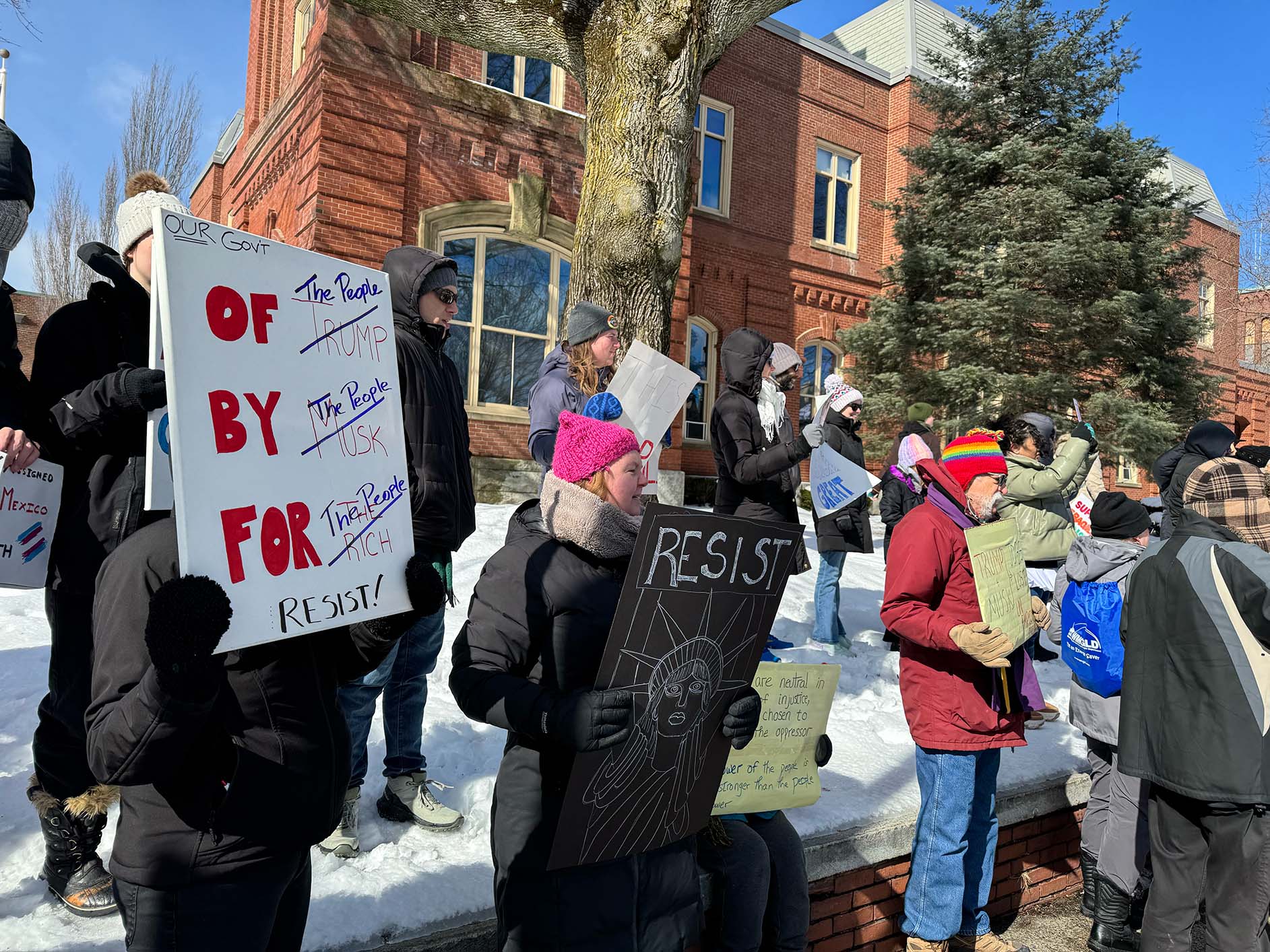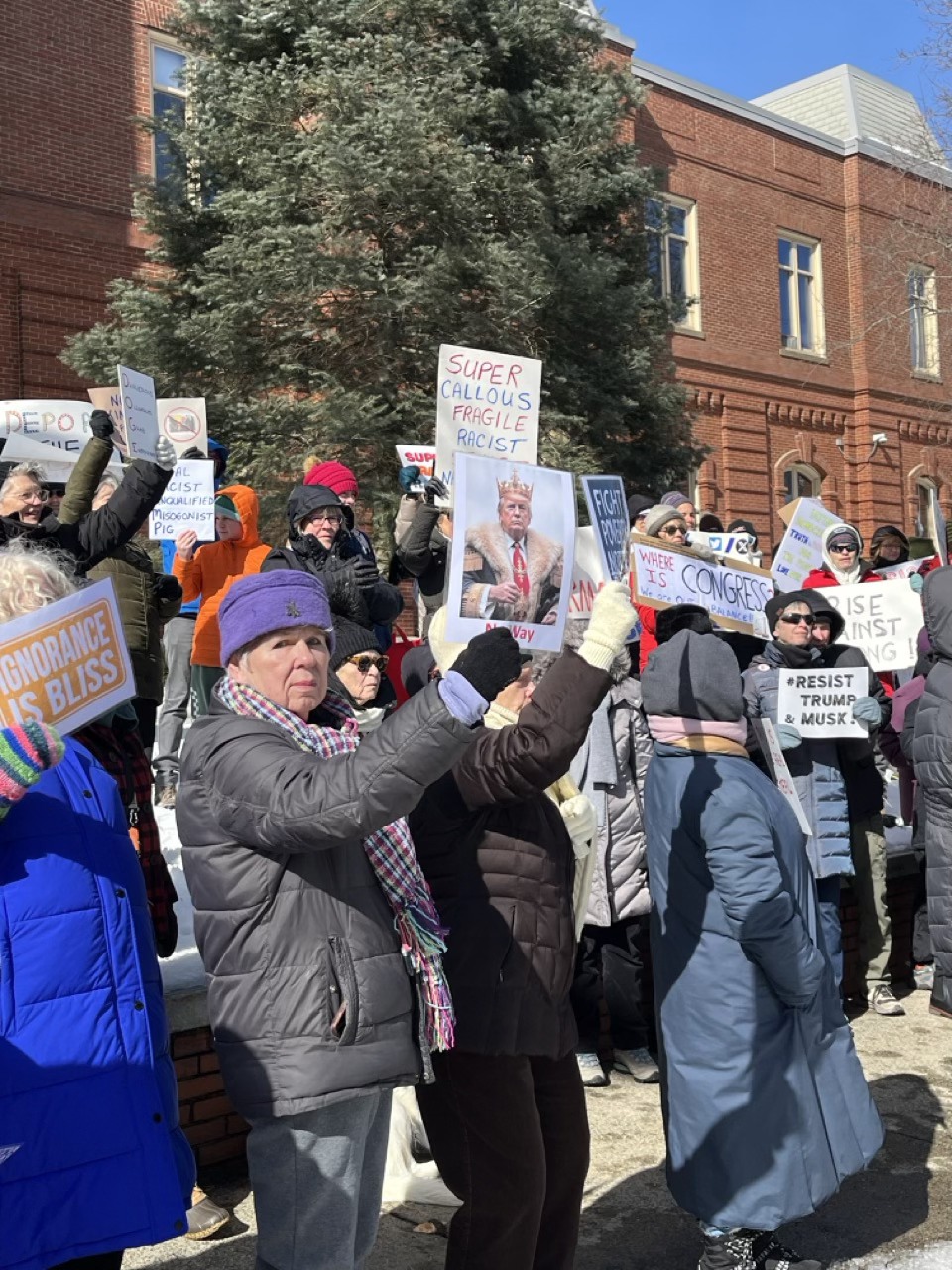 On Presidents Day, despite icy streets and freezing temperatures, over 100 residents gathered in front of City Hall to participate in a rally organized by Mobilize Melrose to express opposition to President Donald Trump’s administration and protest against Elon Musk and the Department of Government Efficiency (DOGE).