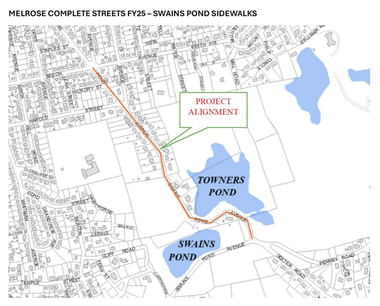 The Department of Public Works (DPW) will likely need to work with Melrose’s Conservation Commission on the design for the project, since construction will be done in wetland areas around Swains Pond and Towners Pond, including on the culvert between the two ponds.