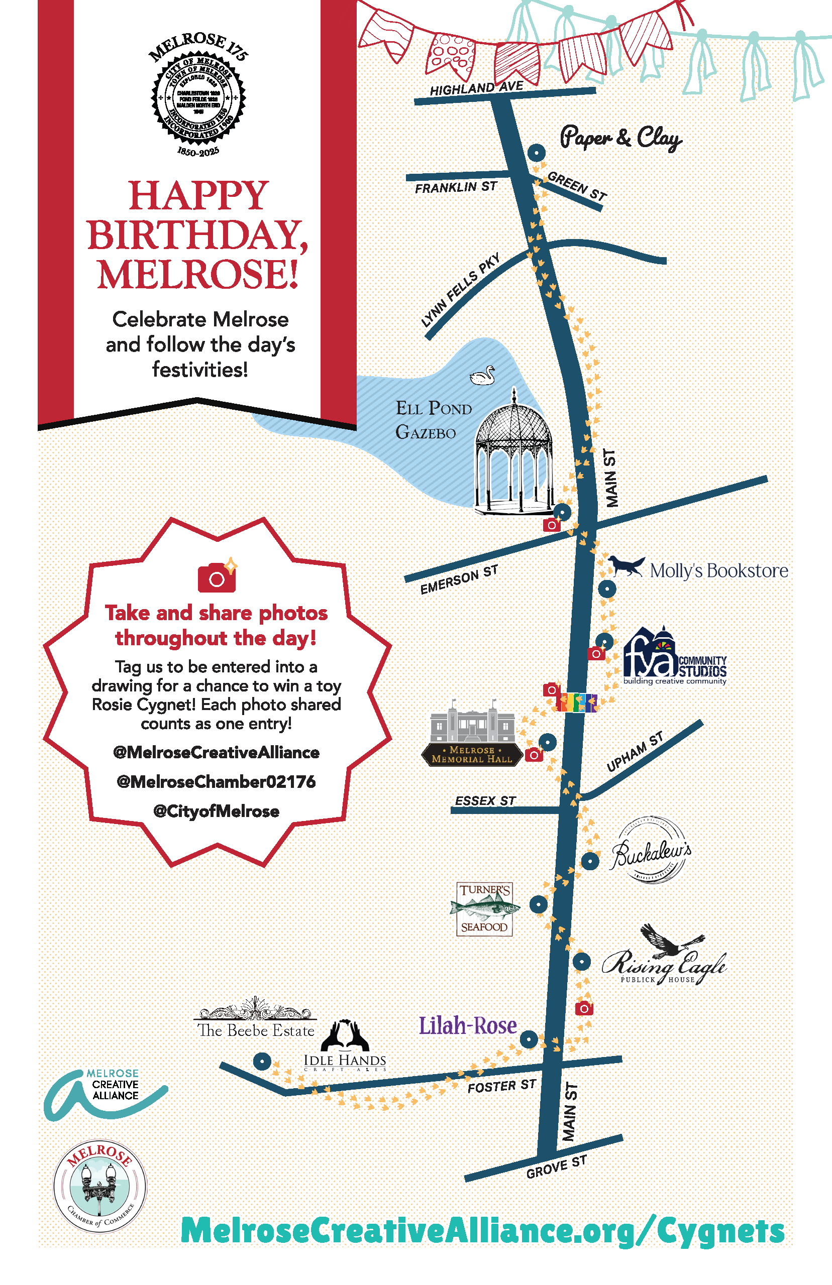 The 175th Anniversary celebration will include a city-sponsored event at Memorial Hall, a Victorian Garden Party at the Beebe Estate, and the Make Way for Cygnets citywide celebration of Melrose families.