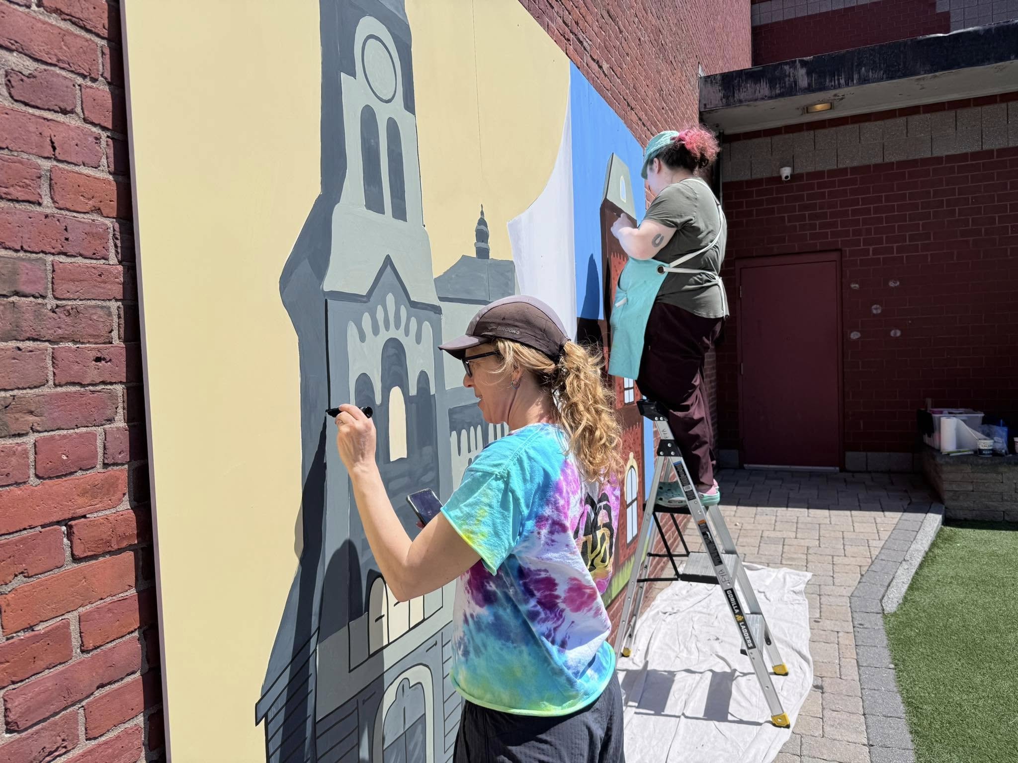 Kris Rodolico, left, and Chiara Pieri of Follow Your Art painting a mural at the YMCA to celebrate Melrose's 175th anniversary