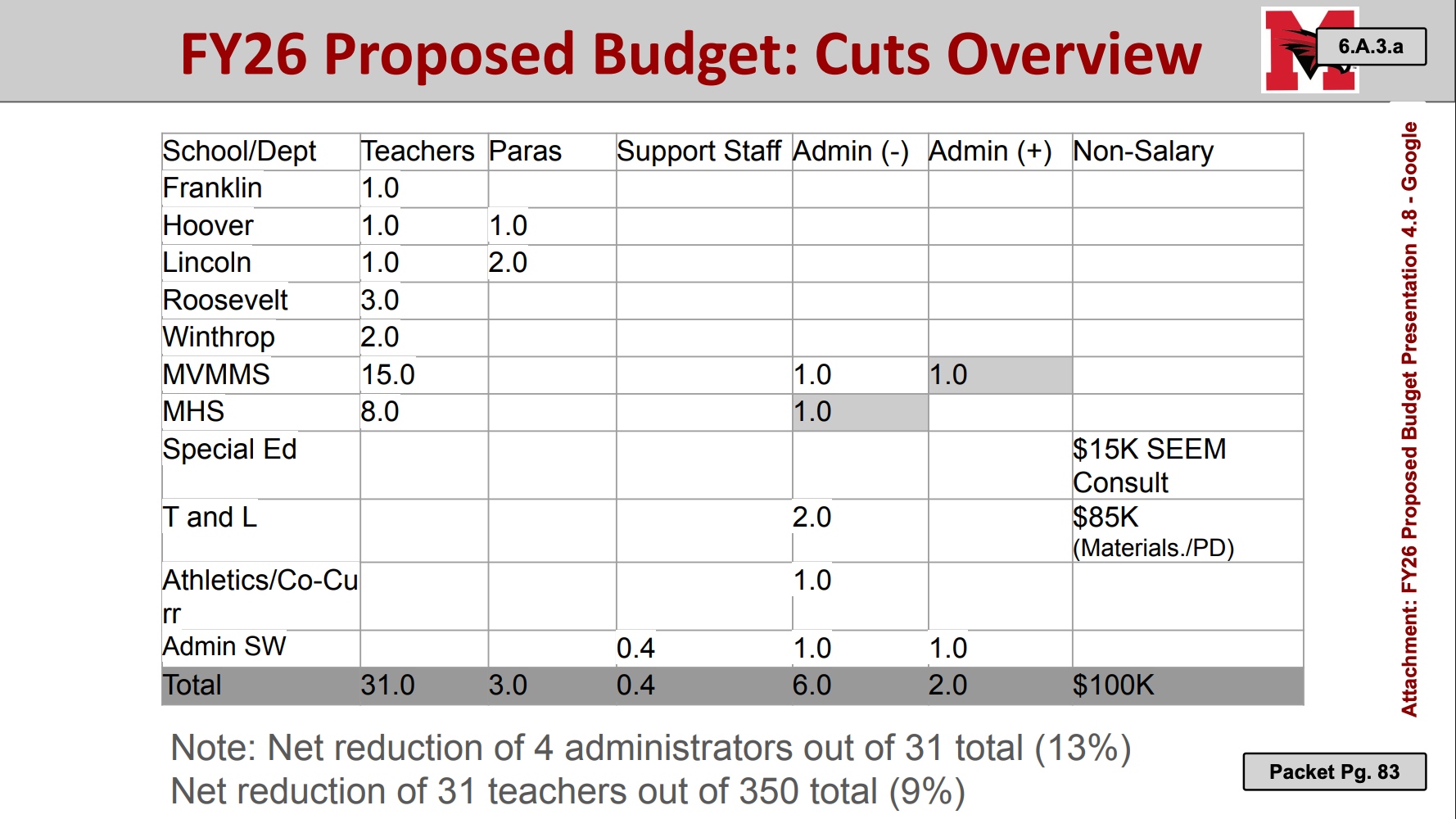 Last year, the School Committee voted to add ten new positions at Melrose Veterans Memorial Middle School (MVMMS), which is the district’s lowest-performing school, even as positions were cut at other schools in the district. Now, all ten of those positions, along with five others, are slated for elimination. Withey and McAndrew’s proposal could potentially bring back two of those.