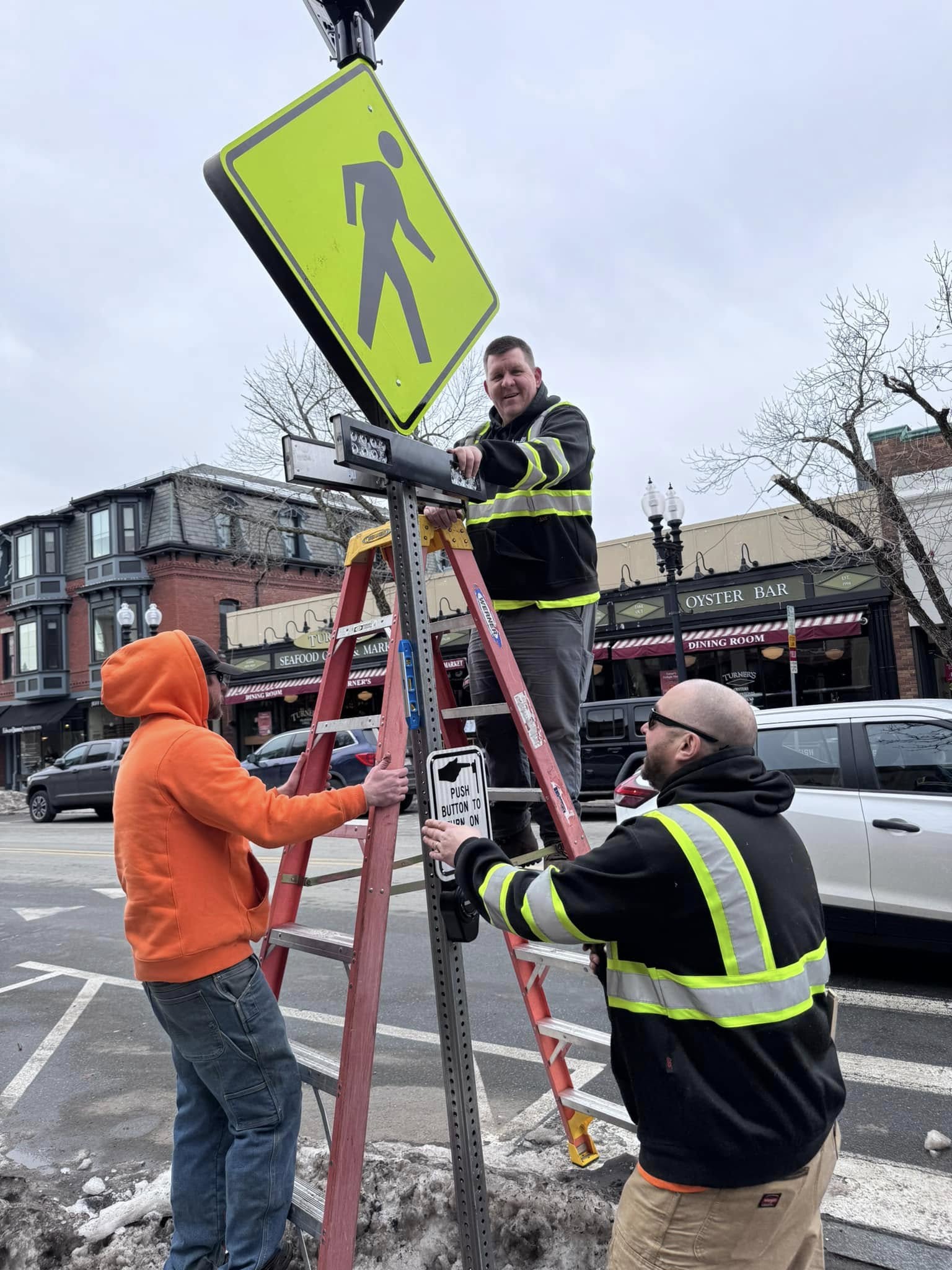 DPW workers installing crosswalk beacons on Main Street