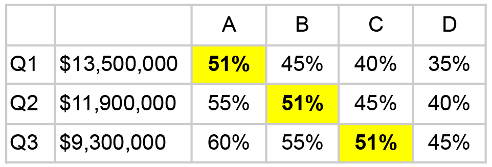 Figure A: The image above shows percentages of "Yes" votes for each override question in four example scenarios, A through D. The highlighted amount is the winning amount, if any. Note that in each scenario, only one override amount goes into effect.