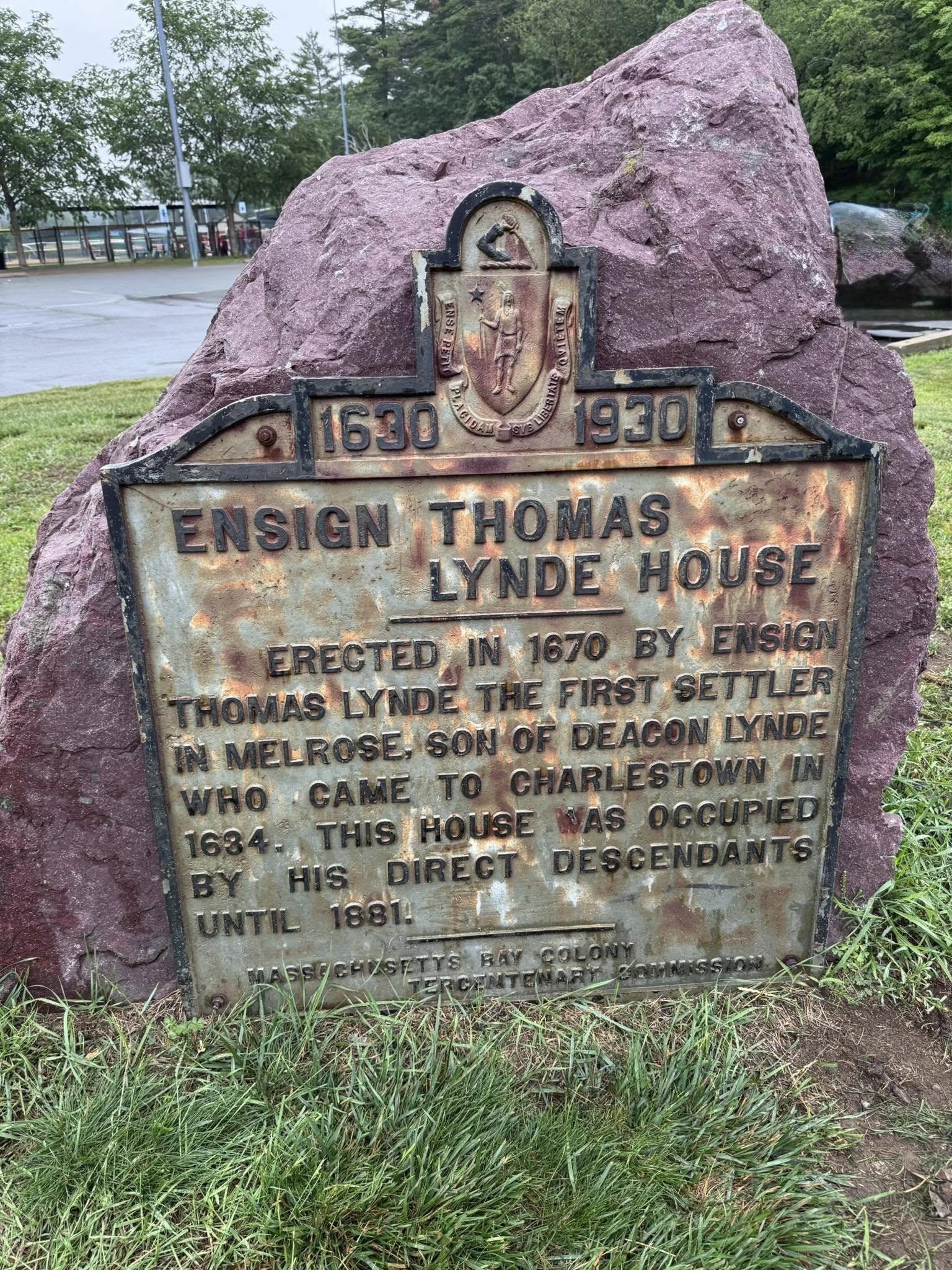 The Lynde family (first settlers of Melrose) was among the most prolific enslavers in the area. Markers throughout the city commemorate Deacon Thomas Lynde (in the park at the corner of Lebanon and Lynde St)) and Ensign Thomas Lynde, veteran of King Philip’s War (1675-1678), whose home once stood at 86 Main St., where Hunt’s Photo parking lot is today. Deacon Thomas Lynde’s will (1671) left a bequest to dearly beloved wife Rebeckah Lynde: land he bought of Goodman Stowers in Charlestown, a house that Morgan now dwells in and all land belonging to it; his negro Peter and negro girl Nan, two cows commons, a haylot, new frame where the cellar is dug near Morgan’s house, use of the malthouse for the year; half of all his household. Joseph Lynde’s home still stands at 409 Lebanon Street (built in 1702).