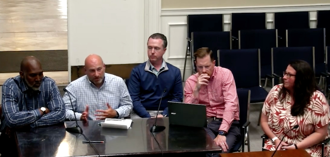 Speaking at the August School Committee Meeting, left to right: MHS Assistant Principal Christopher Beaver, Secondary Principal Jason Merrill, MVMMS Assistant Principal Steve Black, Deputy Principal Bryan Corrigan, and MVMMS Assistant Principal Michelle Sewyck