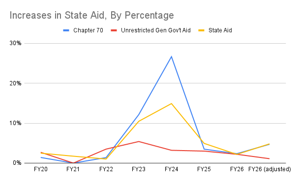 State Aid to Melrose since FY19, by amount (above) and by percentage change (below)