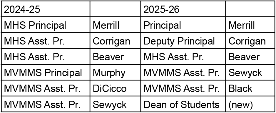 In addition to the loss of 15 teacher positions at MVMMS and eight at MHS - which will mean not only larger class sizes but also fewer adults available to supervise and enforce appropriate student behavior - the middle school principal position was eliminated in the FY26 budget. This makes Jason Merrill, who has been the district's high school principal for over a decade, the leader of both the middle and high schools. Bryan Corrigan, who has been one of the two assistant principals at MHS, will serve as Deputy Principal of both schools, leaving Christopher Beaver in his position as assistant principal at MHS, and Michelle Sewyck and Steve Black as assistant principals at MVMMS.