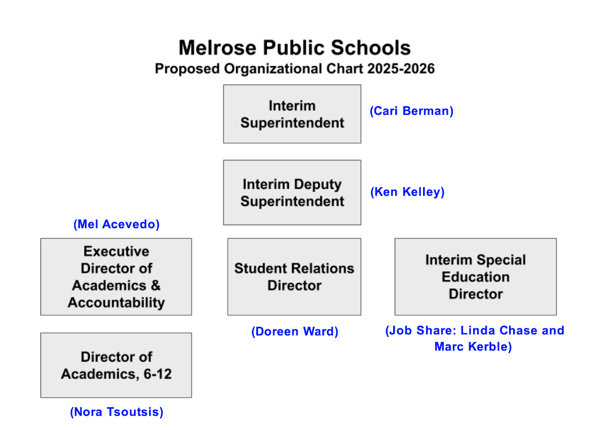The reorganization of the Melrose Public Schools’ Central Office, which began during the budget process this spring and continued with the departure of Adam Deleidi from the superintendent position in June, appears to have concluded with the hiring of the final member of the executive team. And the now-combined leadership team of Melrose Veterans Memorial Middle School (MVMMS) and Melrose High School (MHS) will be complete when a final member of that team is hired soon.