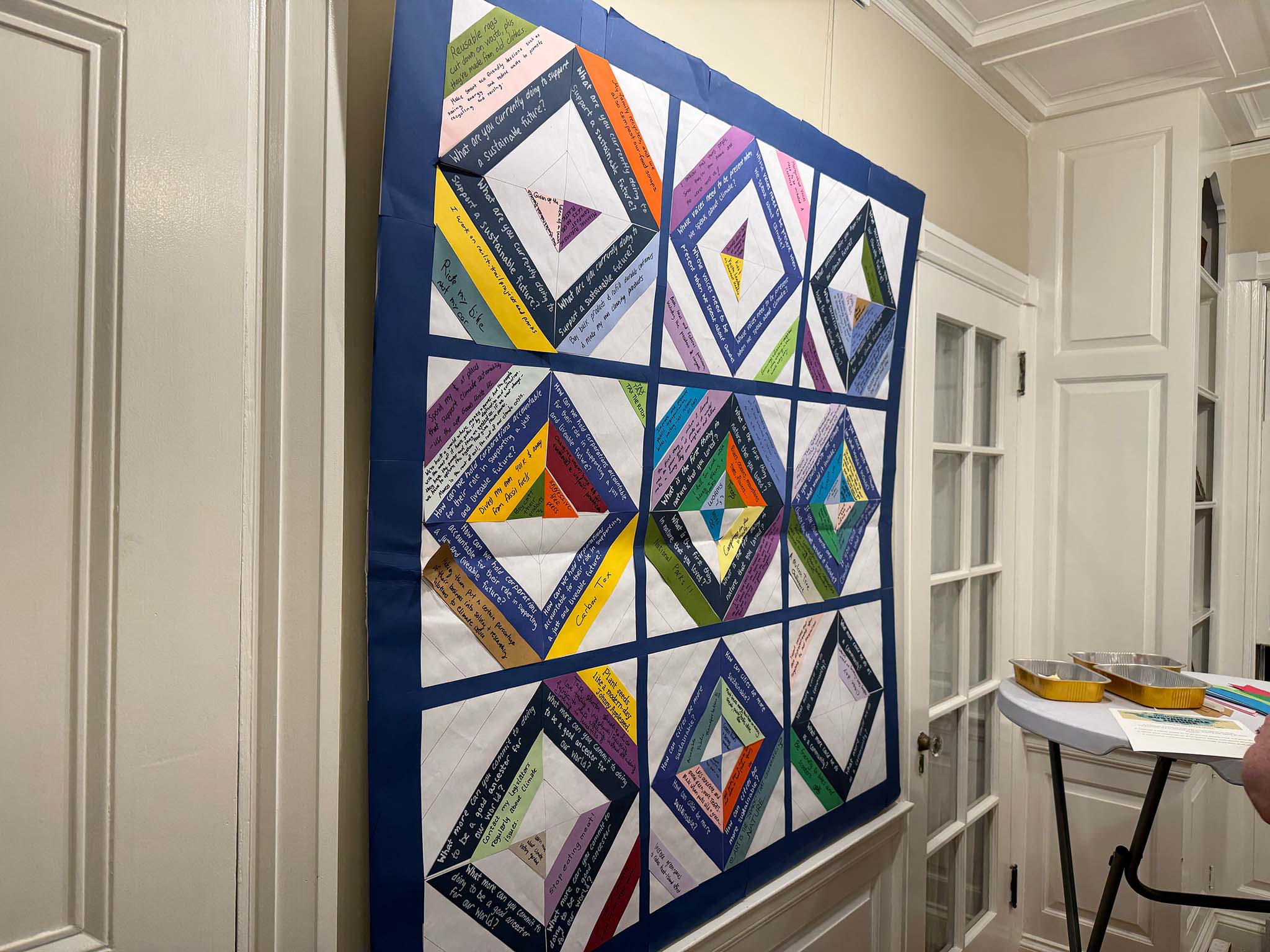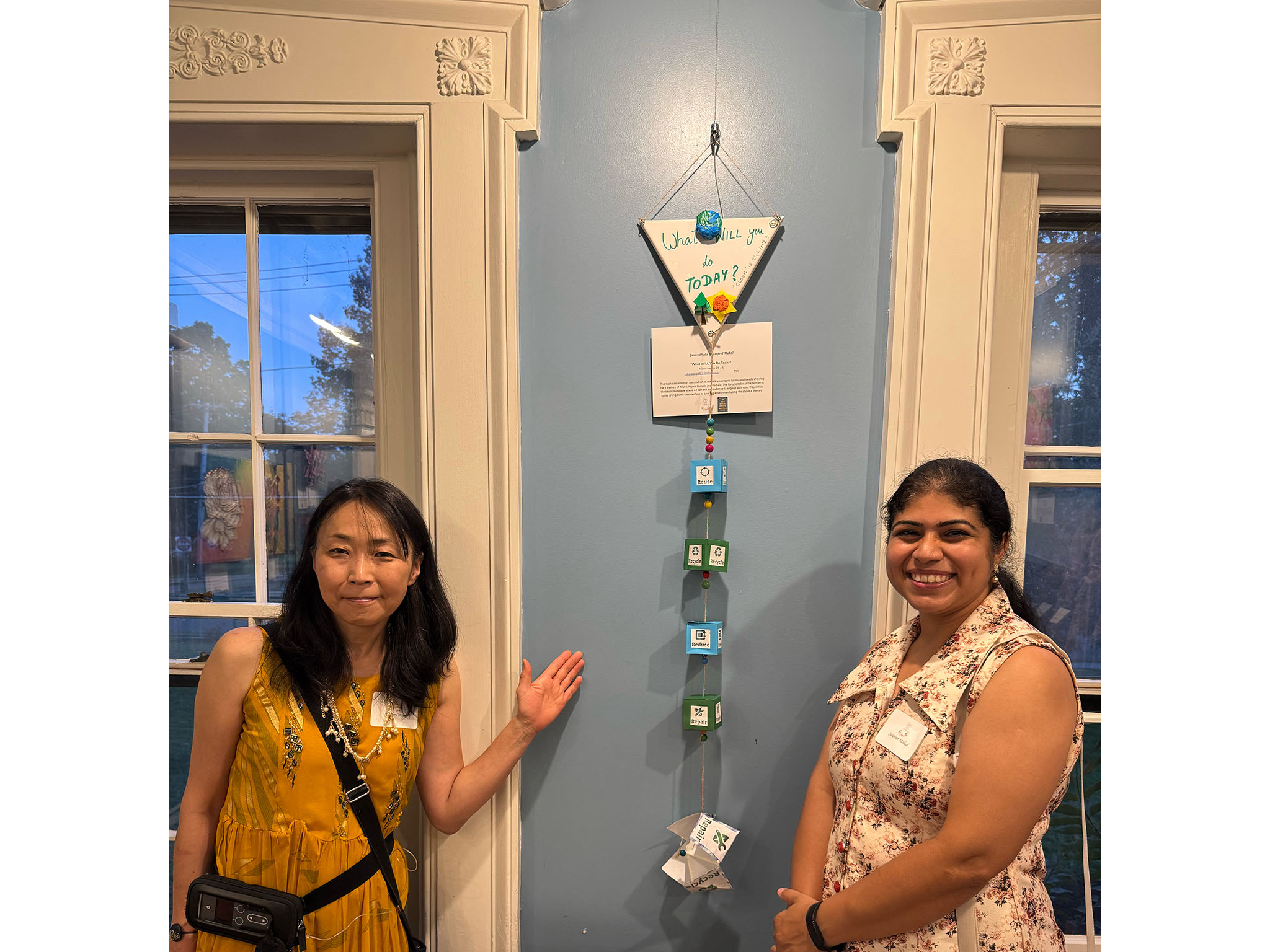 Audience members shared ideas for creating less waste and being more sustainable. One of the artists noted that, growing up in India, there was a culture of repairing broken or damaged items, rather than throwing them away. Some brought up resources like Lend and Mend's Repair Cafes or local Buy Nothing groups on Facebook. Zero Waste Melrose collaborated on the exhibition, providing some recycling and sustainability tips as well.