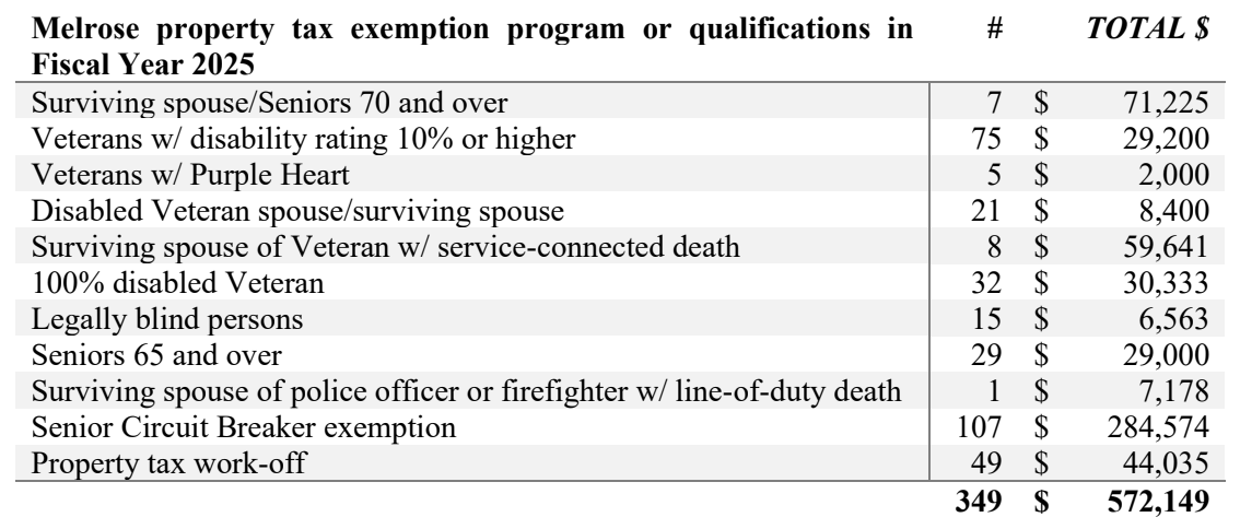 While in recent years, city officials in Melrose have sought to extend property tax relief to additional groups of residents who may struggle to afford their tax bills and increase the amount of tax relief they are eligible for, there may be additional forms of tax relief that have been authorized by the state but are not currently offered in Melrose.