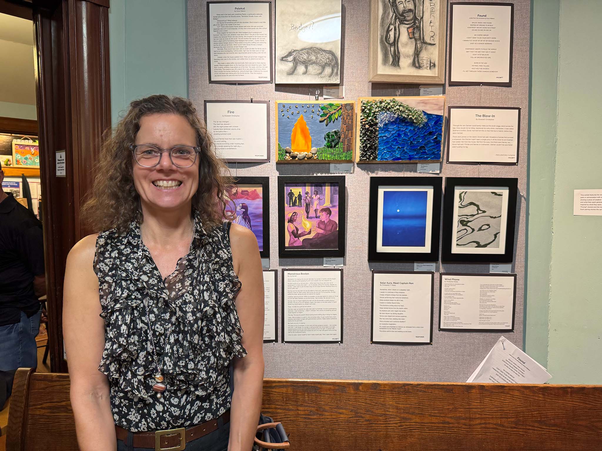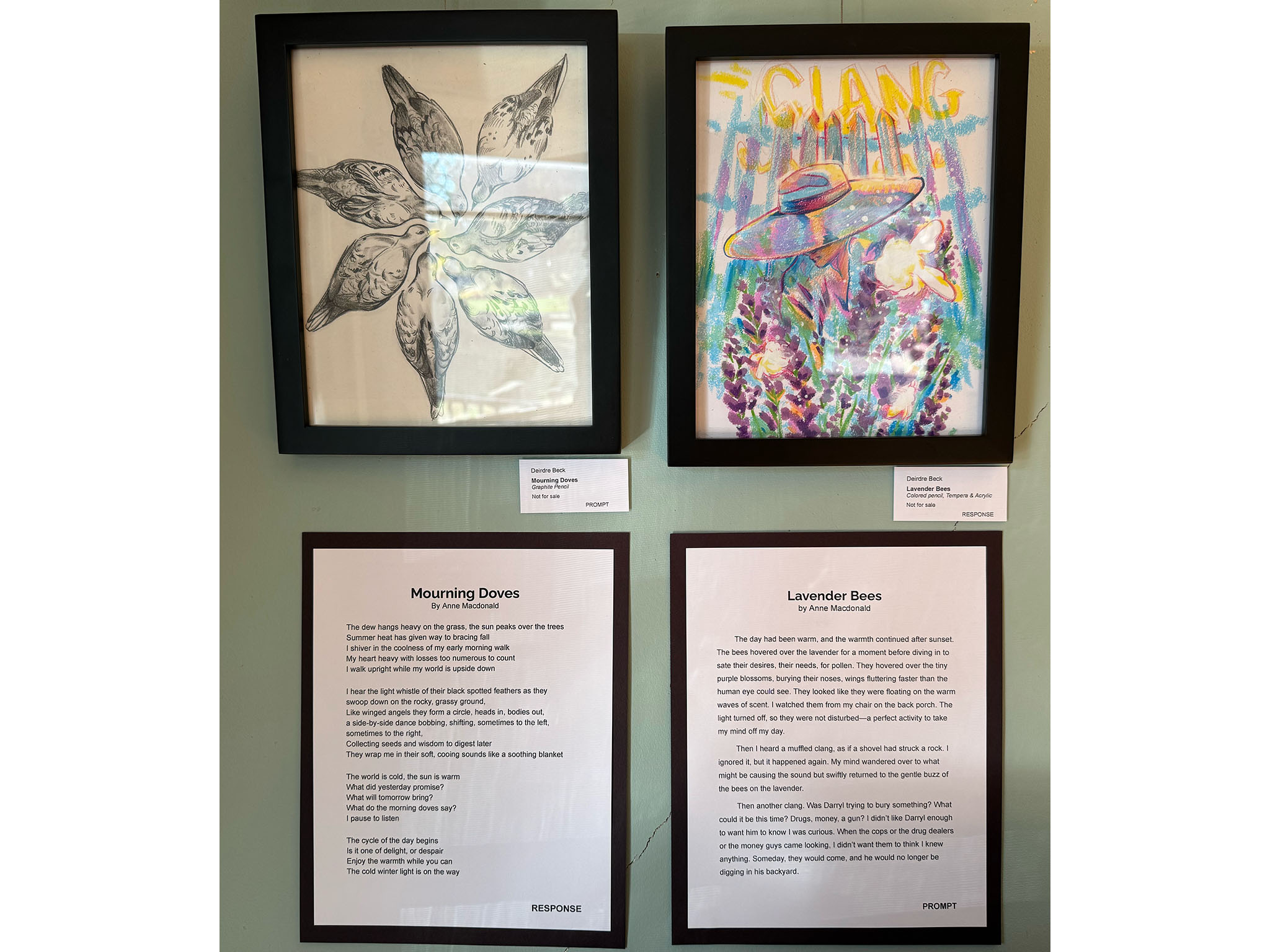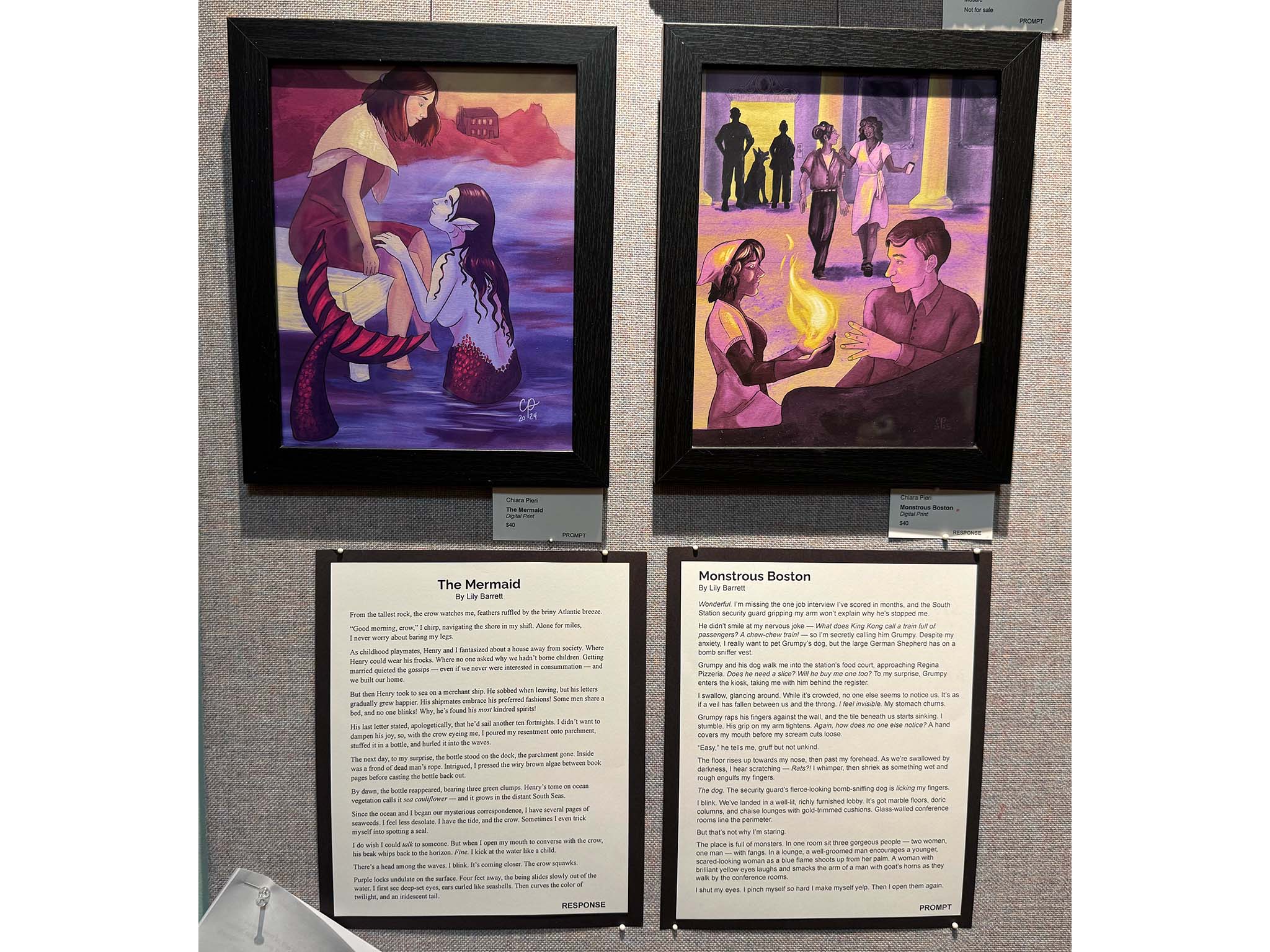 The exhibition shows off a range of formats for both writing and art. Writers created poems and short stories in all genres - fantasy, realistic, children’s stories. Many artists’ signature styles were on display, too - Garin Boyd’s charcoal drawings, Kerry Pegoraro’s colorful patterns, Sally Gordon’s paper sculptures.