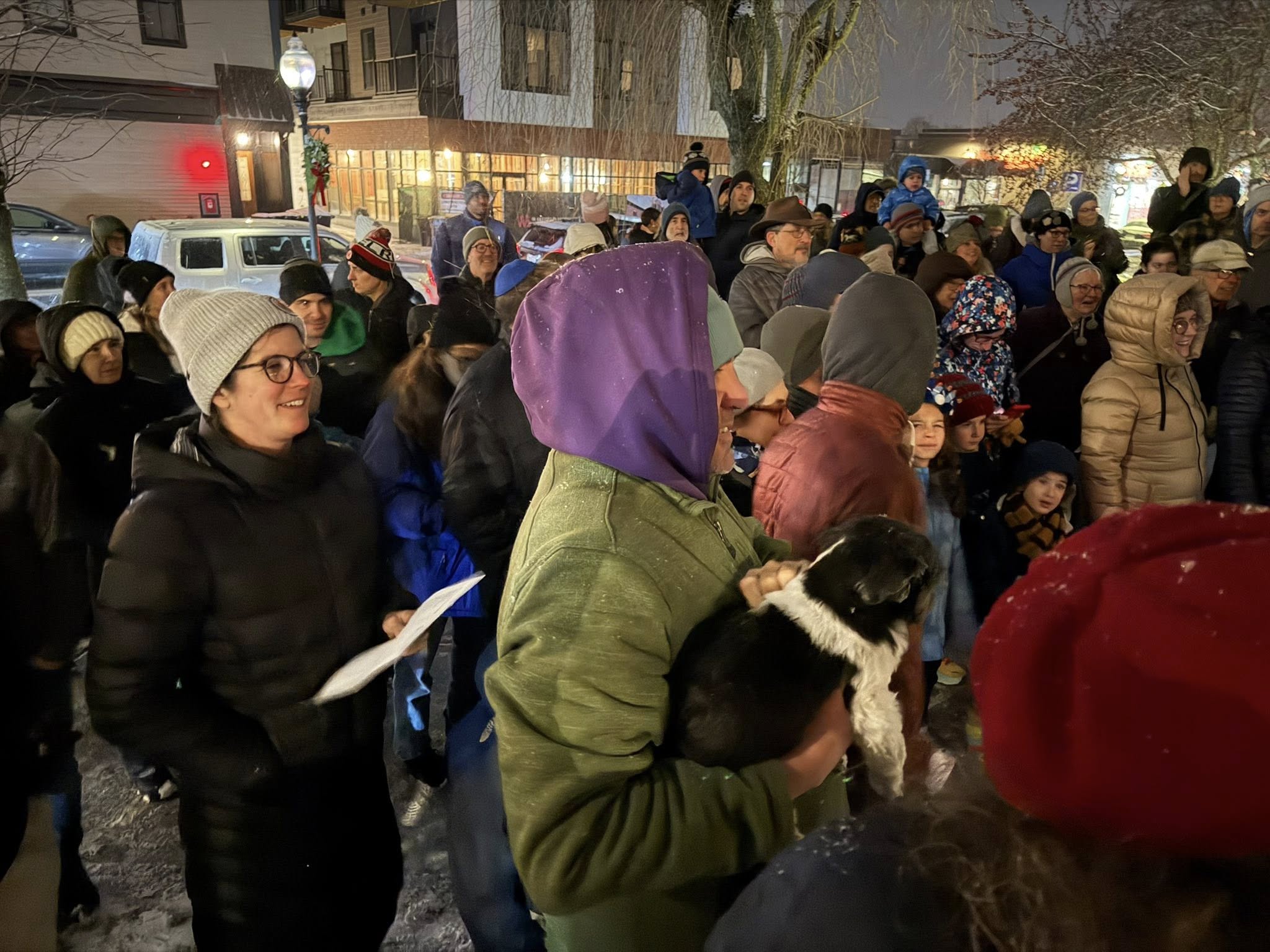In spite of the cold and some light snow flurries, attendance at the event greatly exceeded the organizers' expectations: Lowenthal quipped that they had only printed out 25 song sheets, which quickly ran out even with attendees sharing them.