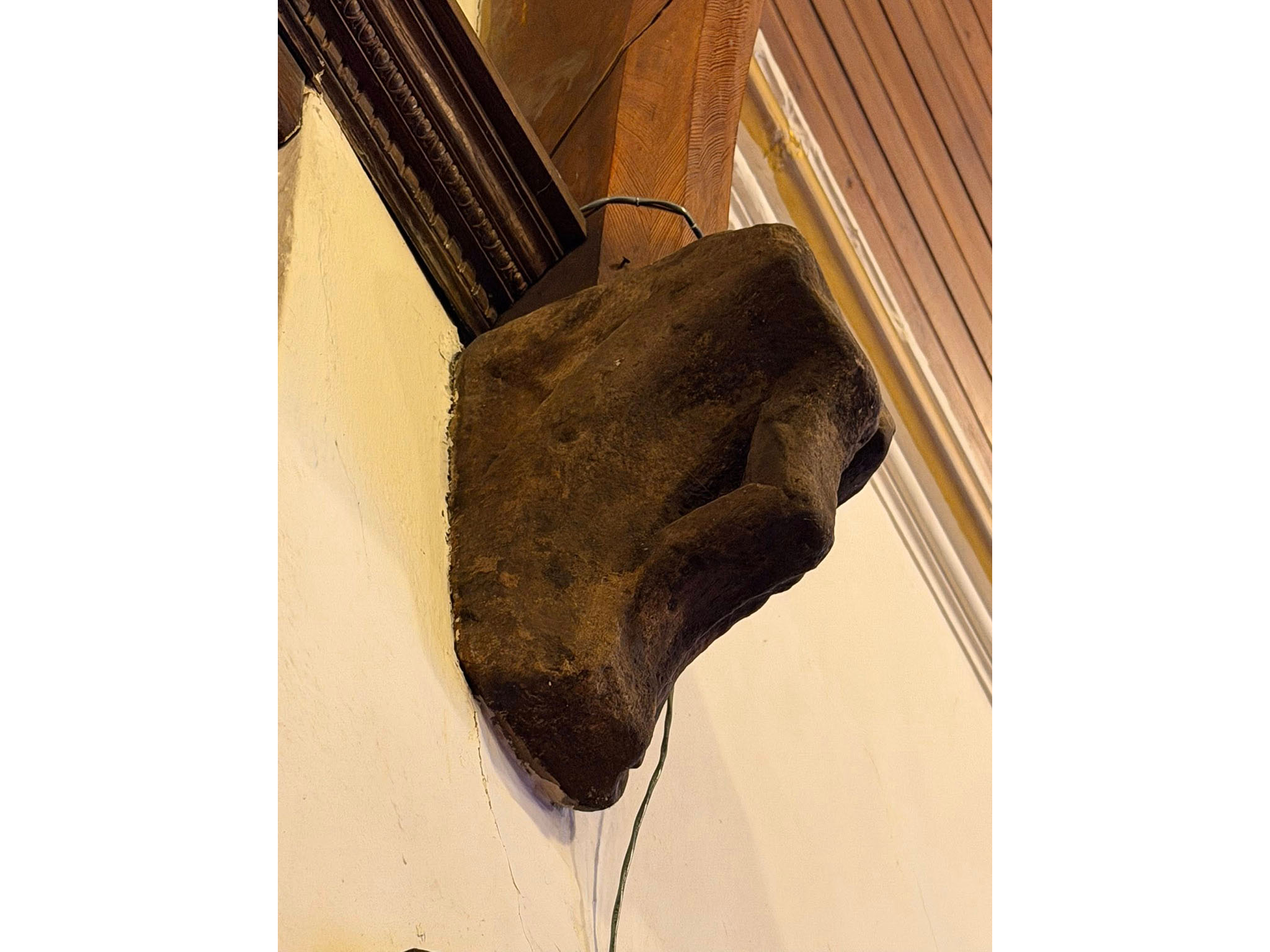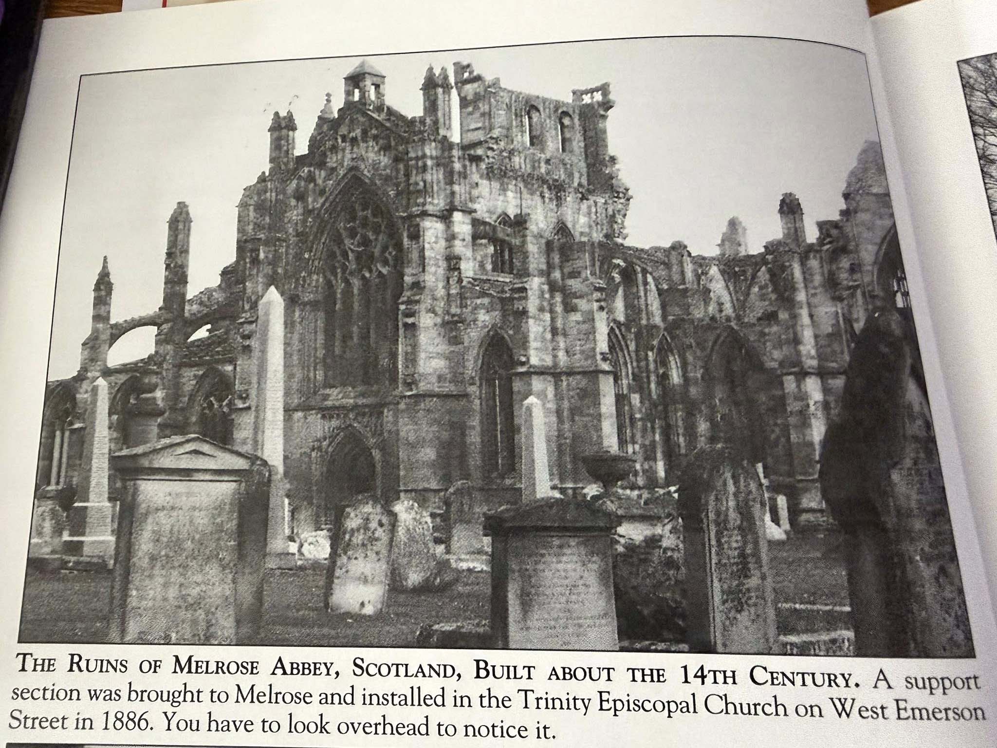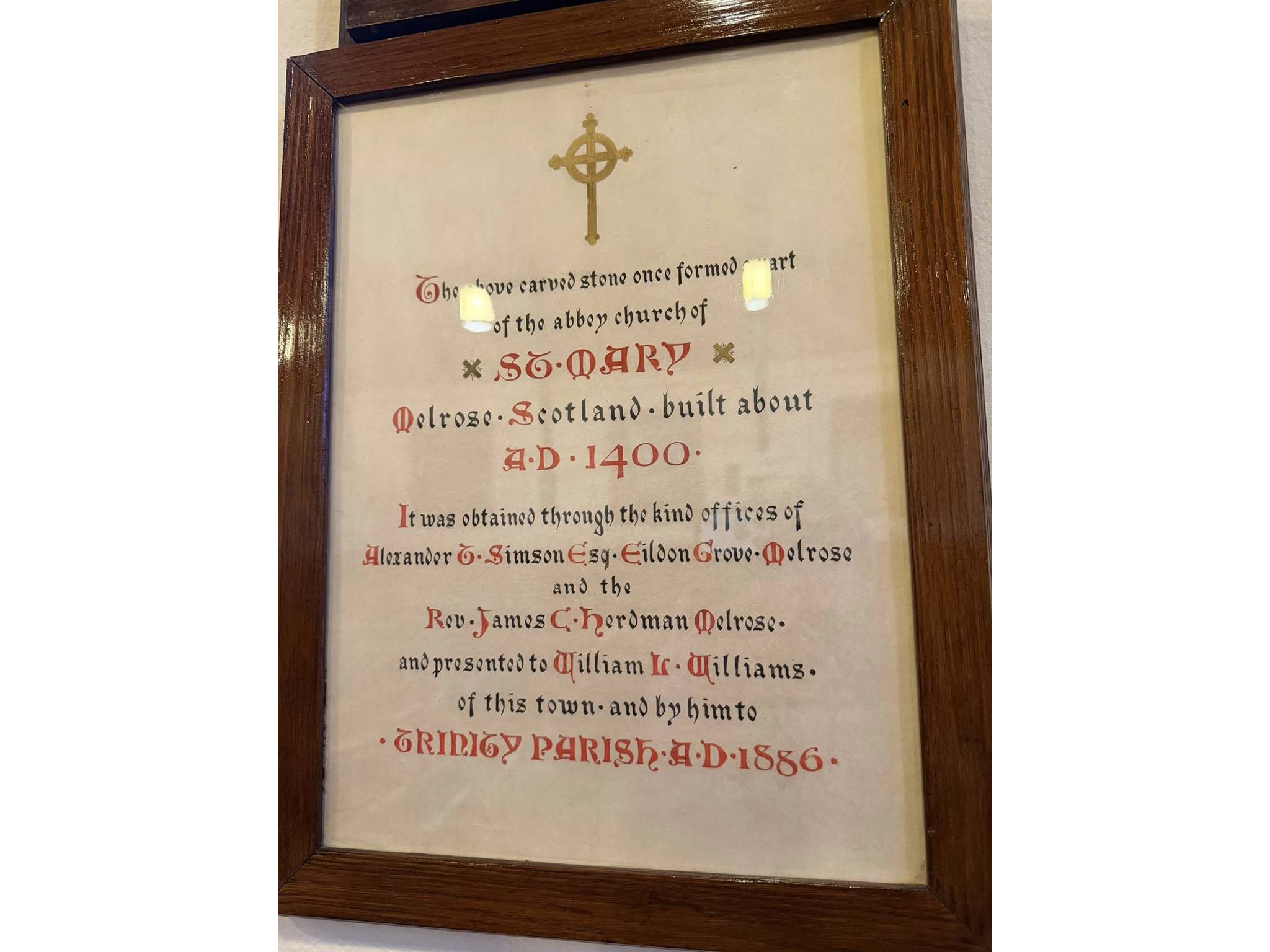 It is a carved stone from St. Mary’s Abbey in Melrose, Scotland. It now rests beneath a truss on the south side of the church.