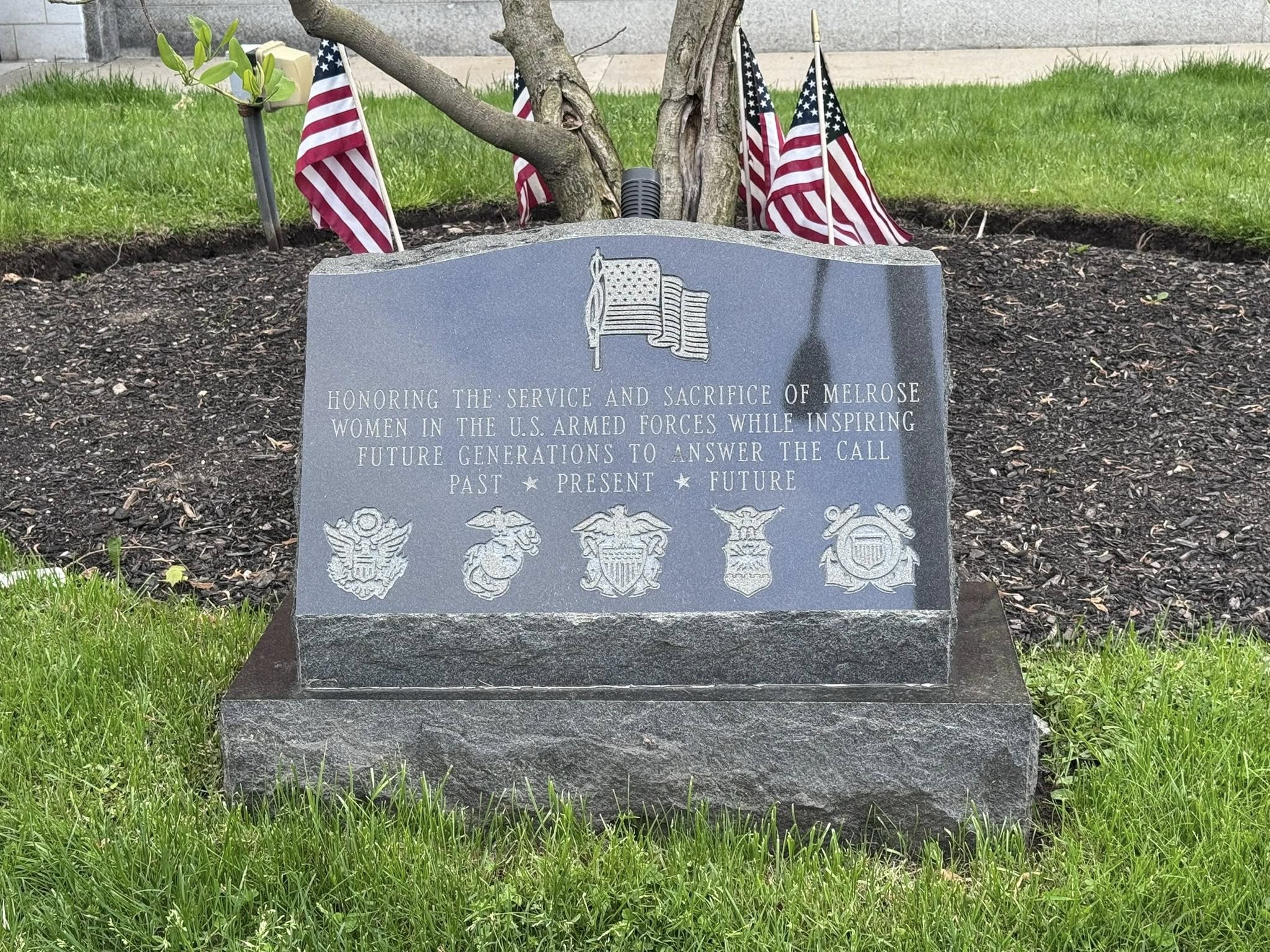 At City Hall stands the Women’s Service Tree Memorial, 562 Main Street — a living tribute to the women of Melrose who served in the U.S. Armed Forces. A Magnolia tree rises beside a polished black granite stone, dedicated on Veterans Day in 2014, through the generosity of the City of Melrose and the Melrose Garden Club.