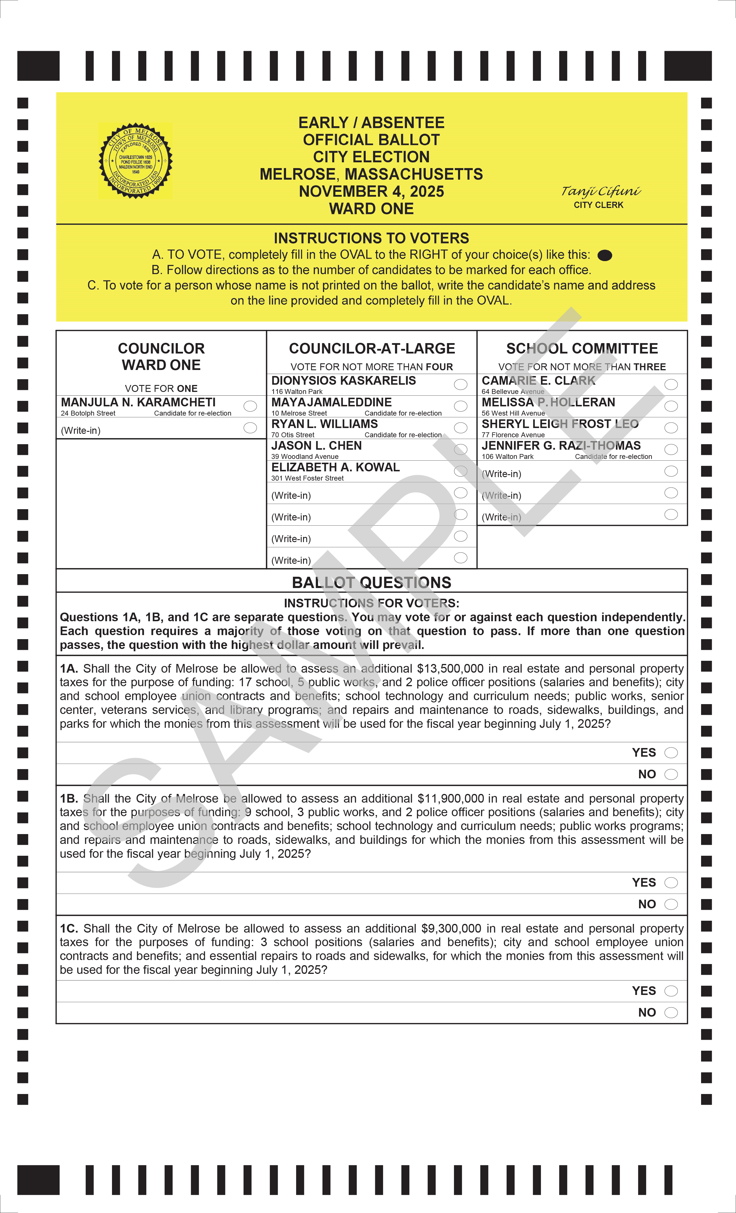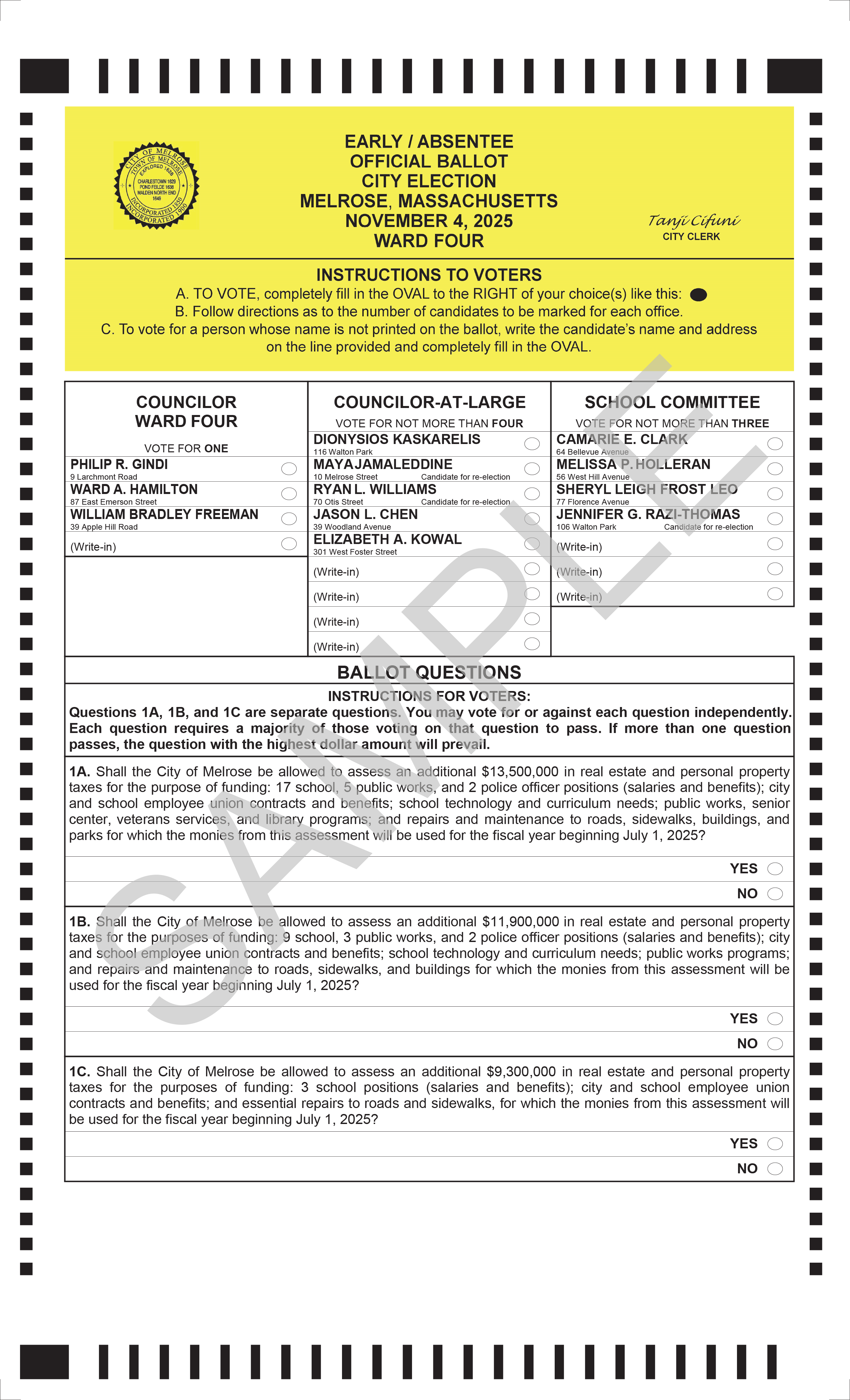 All Melrose voters will elect one City Councilor to represent their ward, four City Councilors At Large, and three School Committee members. They will also vote on three Proposition 2.5 override ballot questions.